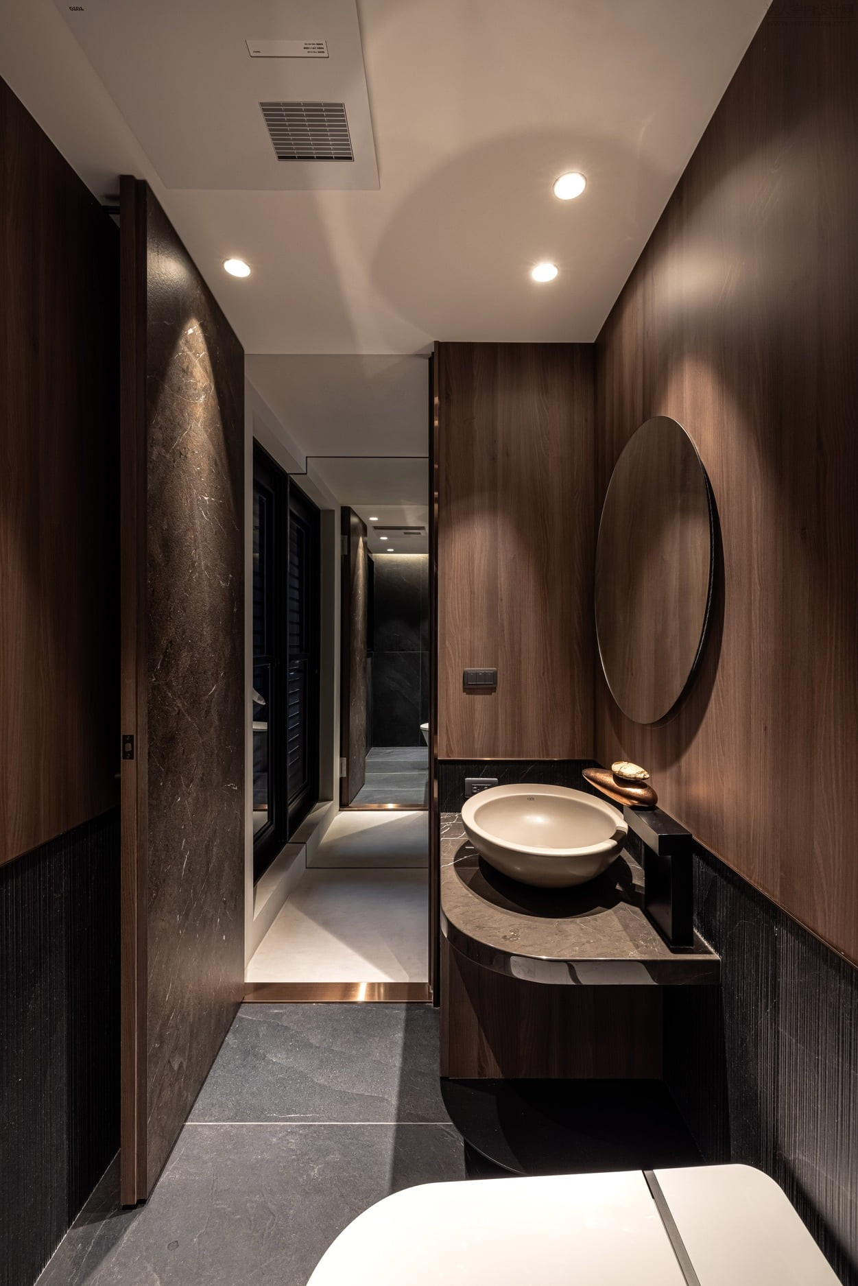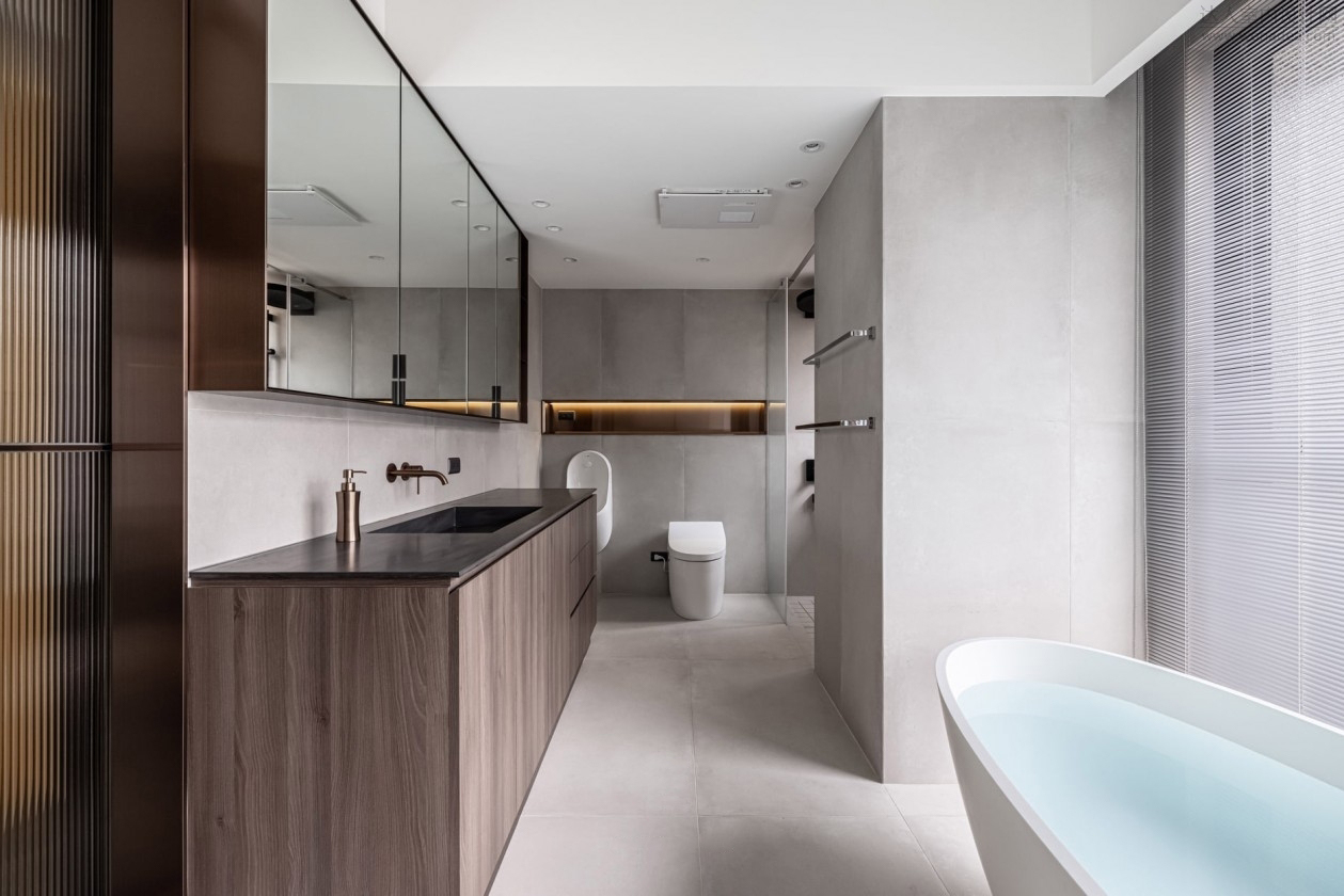 木纹浴室柜+黑色台盆碰撞出层次,嵌入式灯光与独立浴缸提升精致度,百叶帘既保证隐私又不挡光,把“日常洗漱”变成了舒适的仪式感。