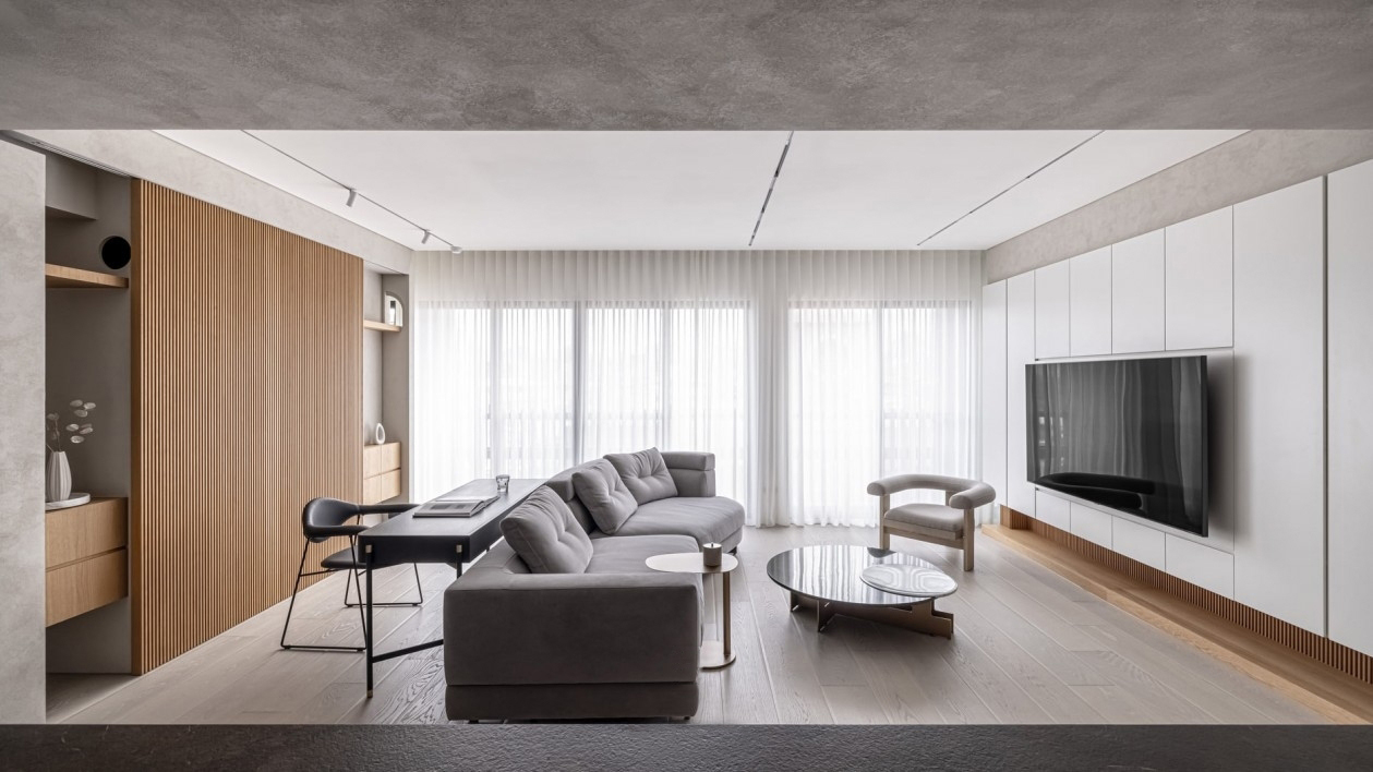 浅灰沙发+玻璃茶几弱化厚重感,木纹格栅墙既是装饰也藏起收纳,白色纱帘让光线柔和漫入,金属轨道灯的线性光让空间层次更通透,整体是“不费力的高级”。
