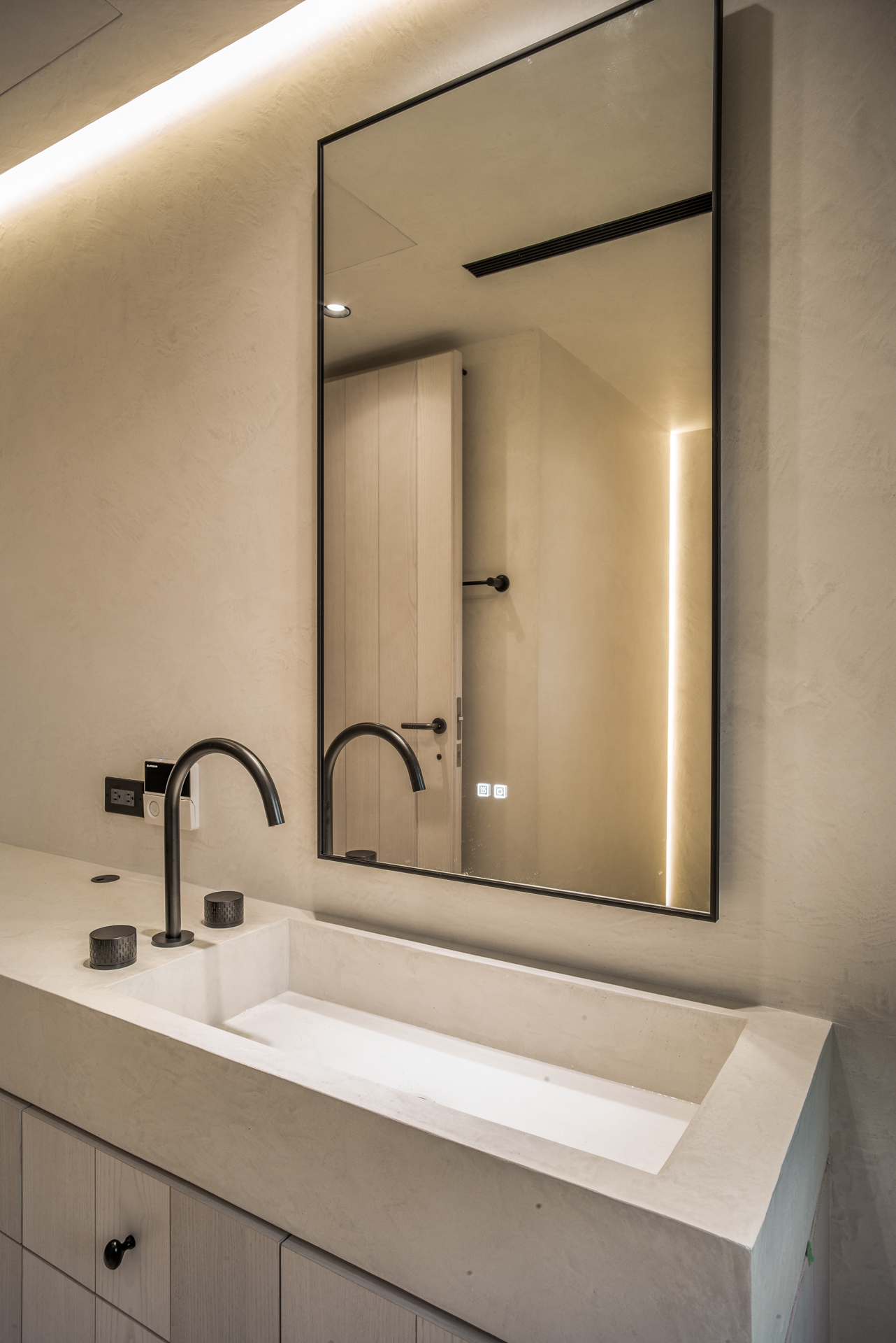 • 卫浴:一体台盆+肌理墙面,黑框镜+暗藏灯带,简约里透着高级质感