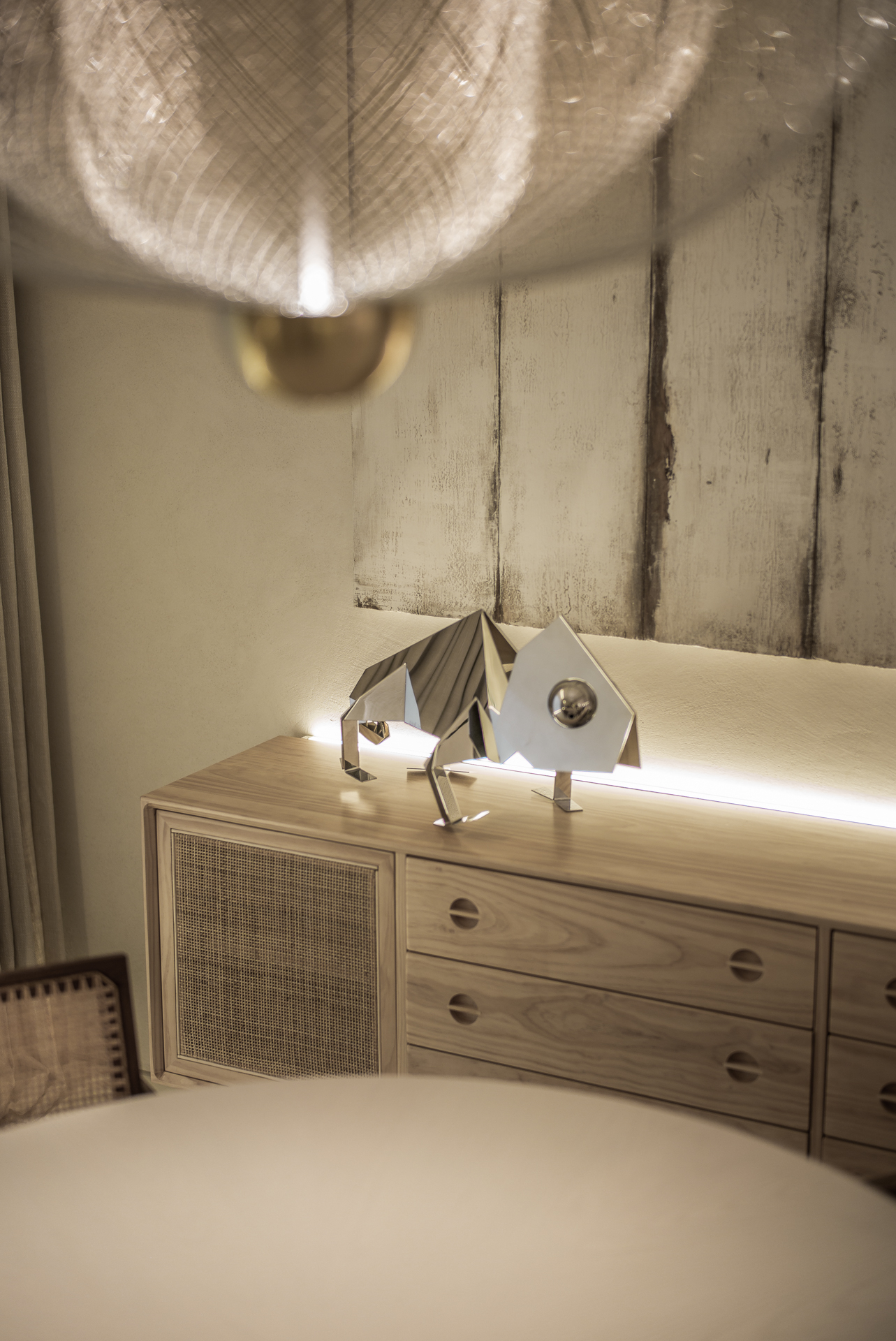 • 客餐厅:镜面隔断+悬浮地台扩宽空间,暖调木色+肌理墙面,搭配编织元素软装,温柔又有呼吸感