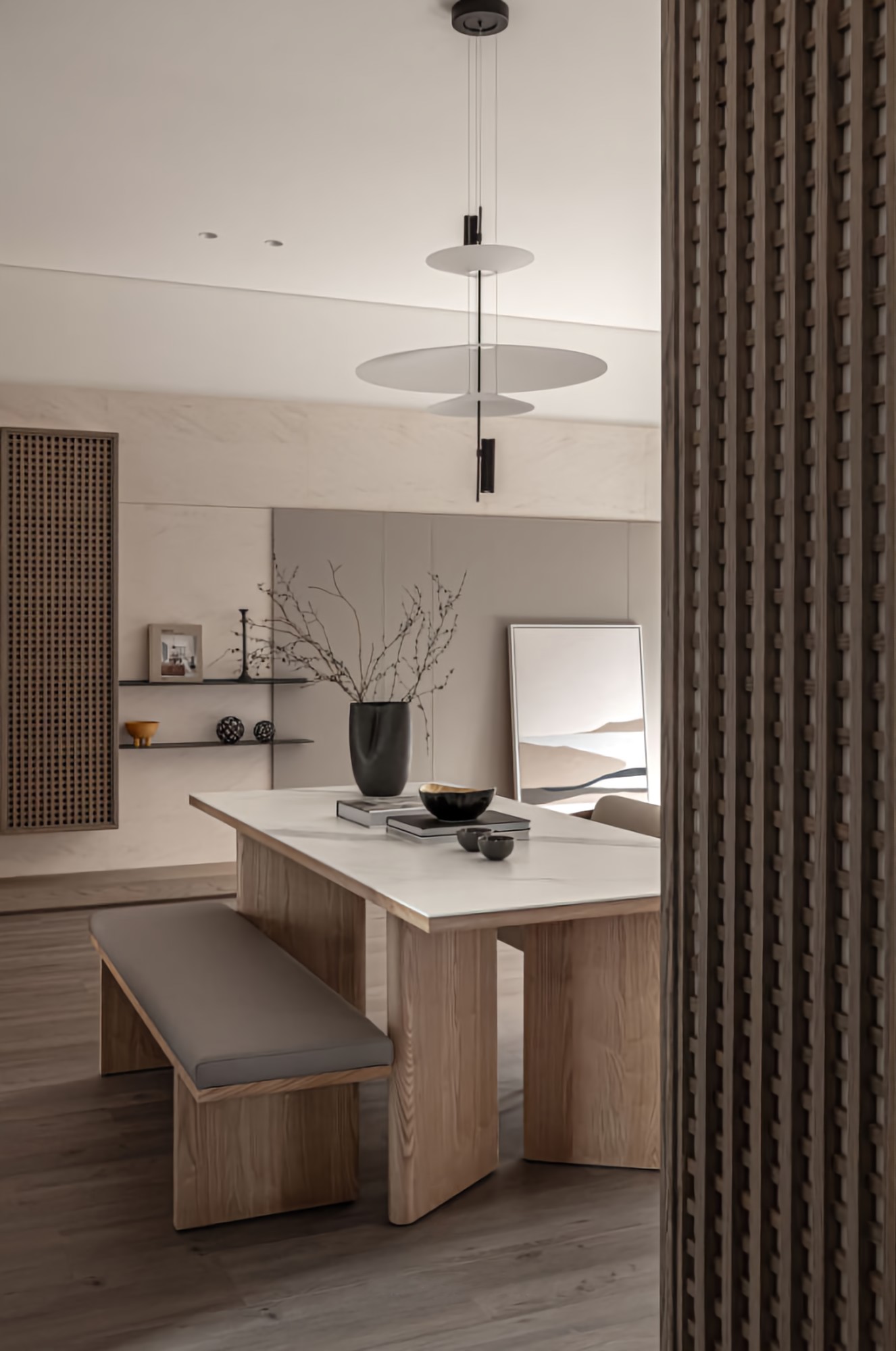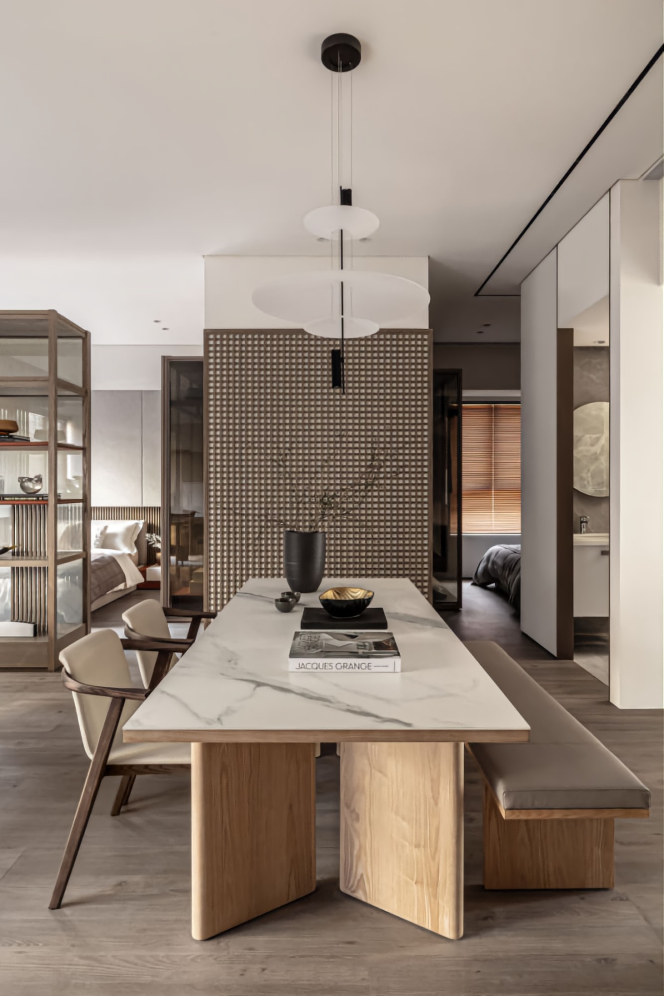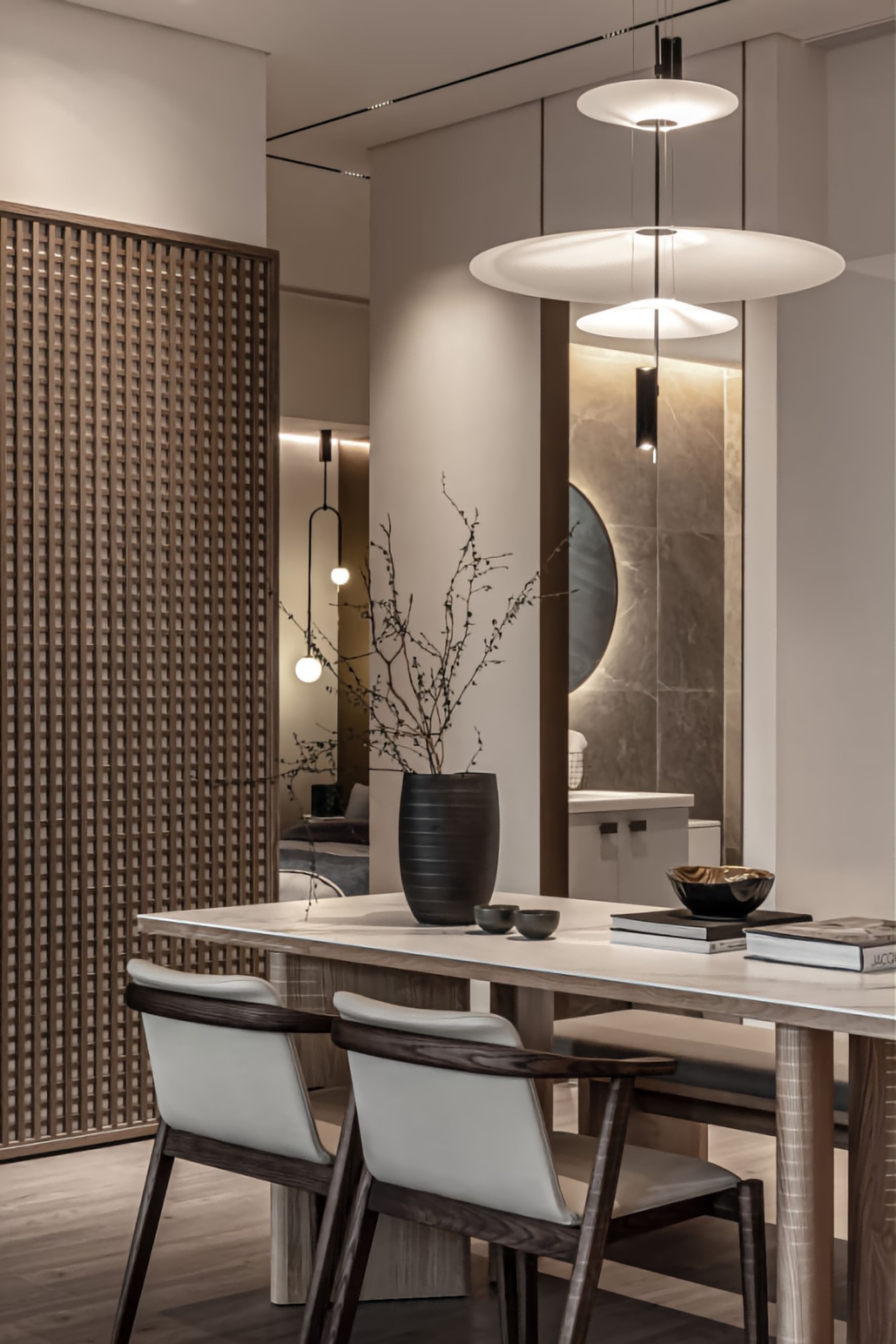 • 餐厨区:木纹+大理石餐桌质感拉满,格栅柜藏灯带,暖光里透着东方禅意;层次吊灯柔化空间,摆件简约却显品味