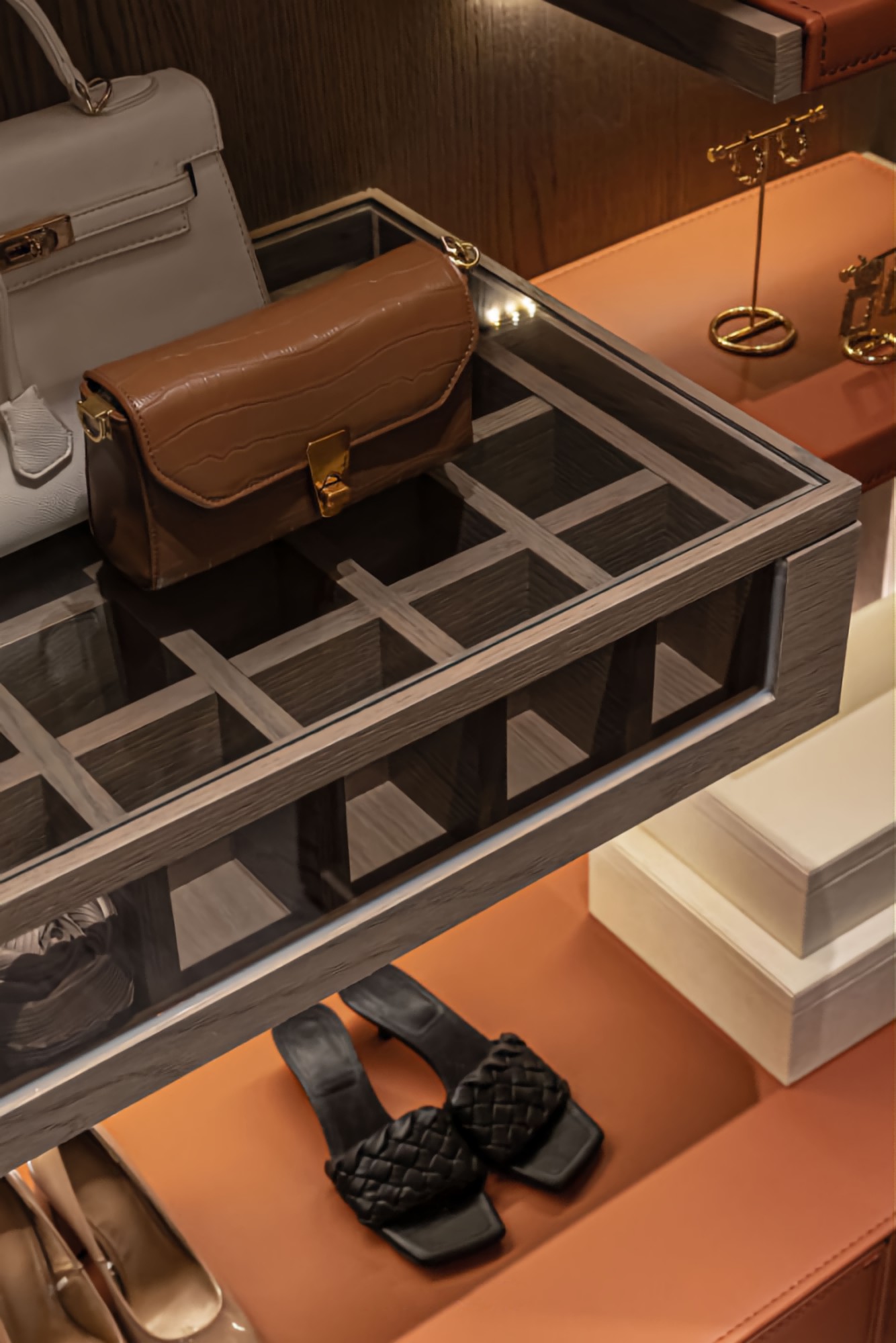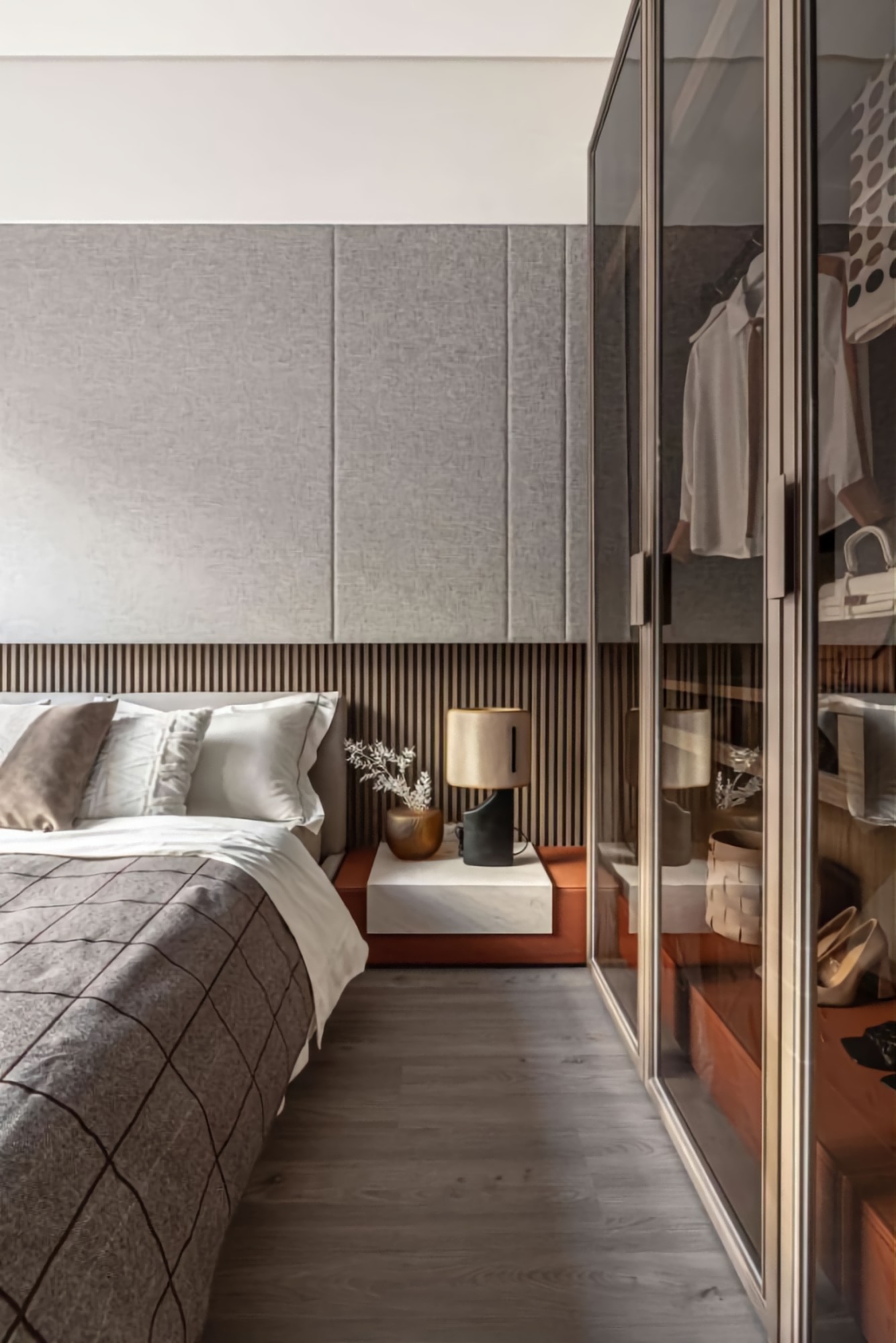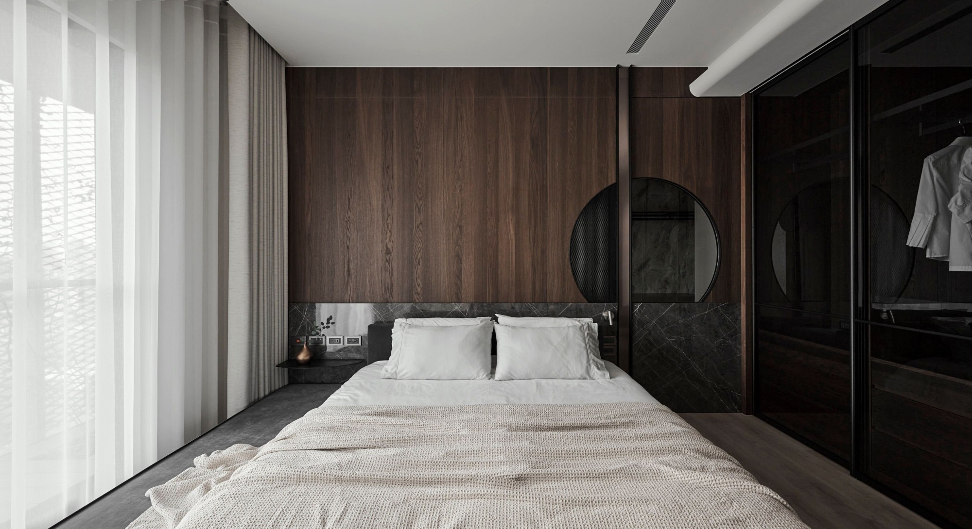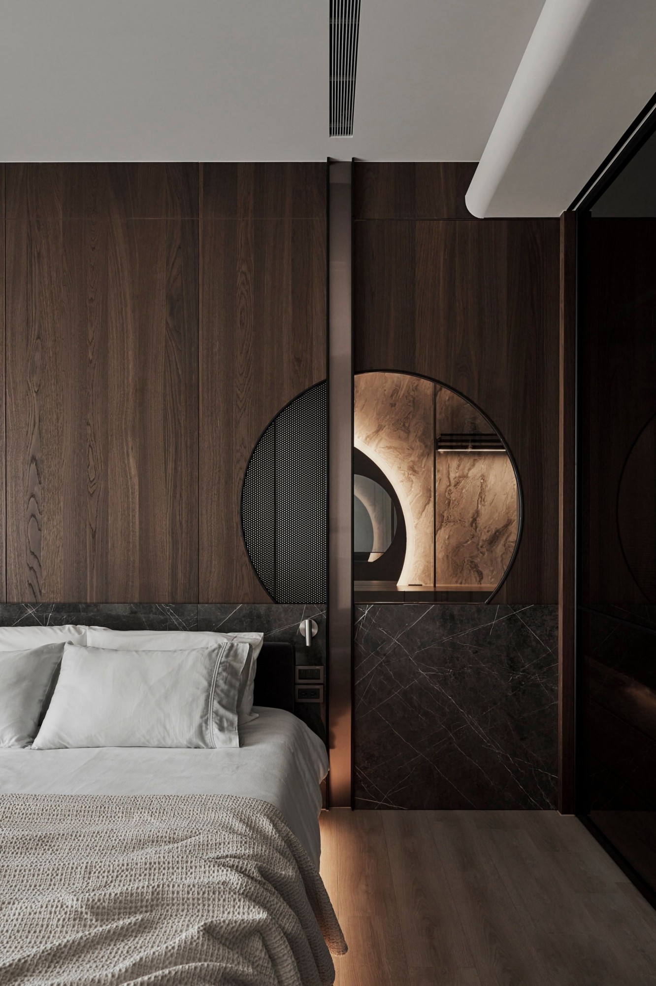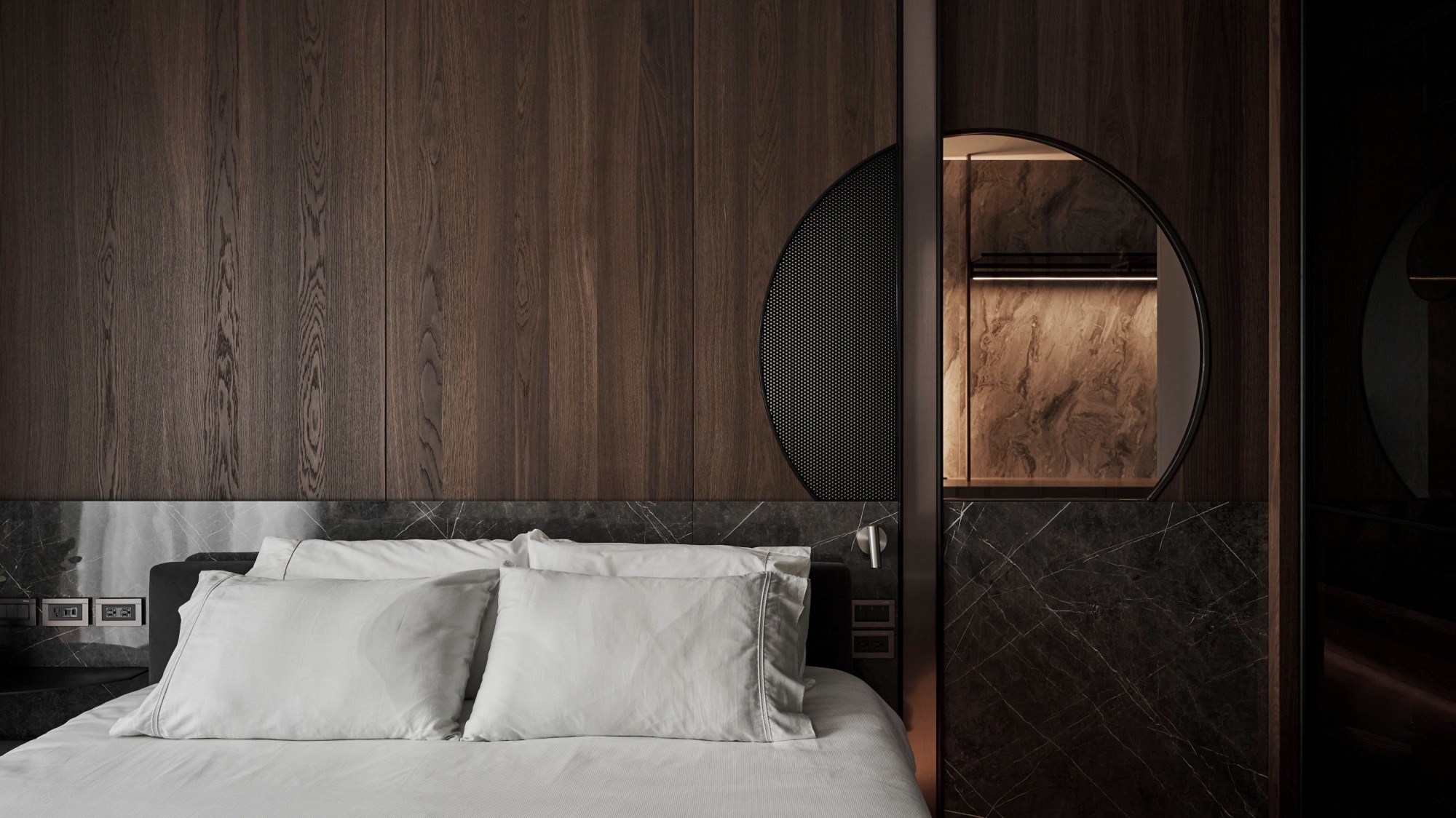 • 卧室:深木纹墙+大理石床头,圆形镜+玻璃衣柜显精致;浅色系床品中和厚重感,低调里藏着轻奢腔调