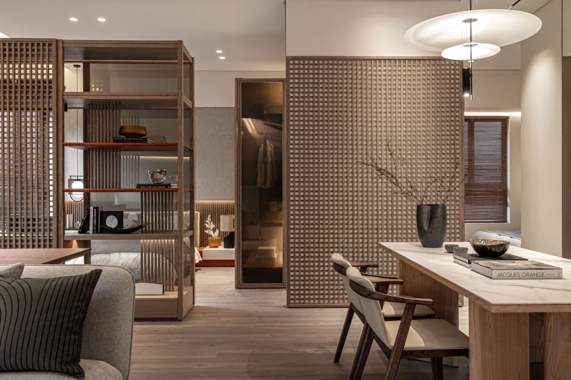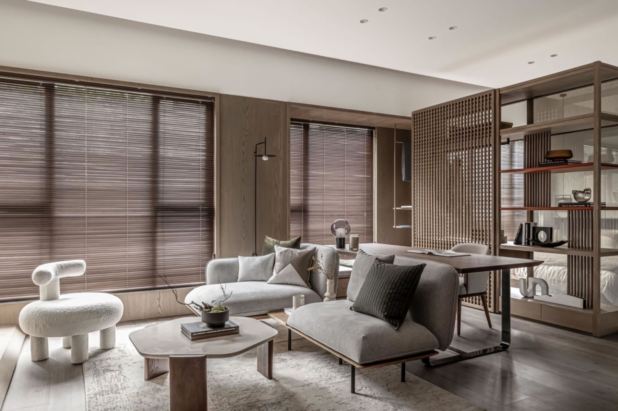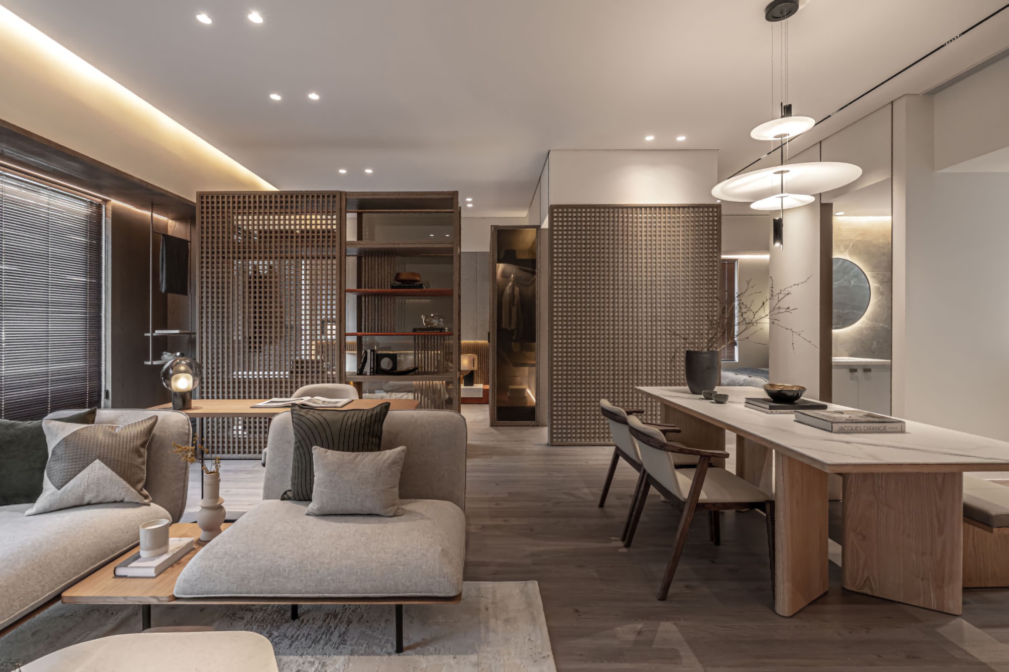 • 客餐厅:低饱和灰调软装+木质百叶窗,格栅隔断既通透又划分区域;软装线条柔和,自带松弛氛围感