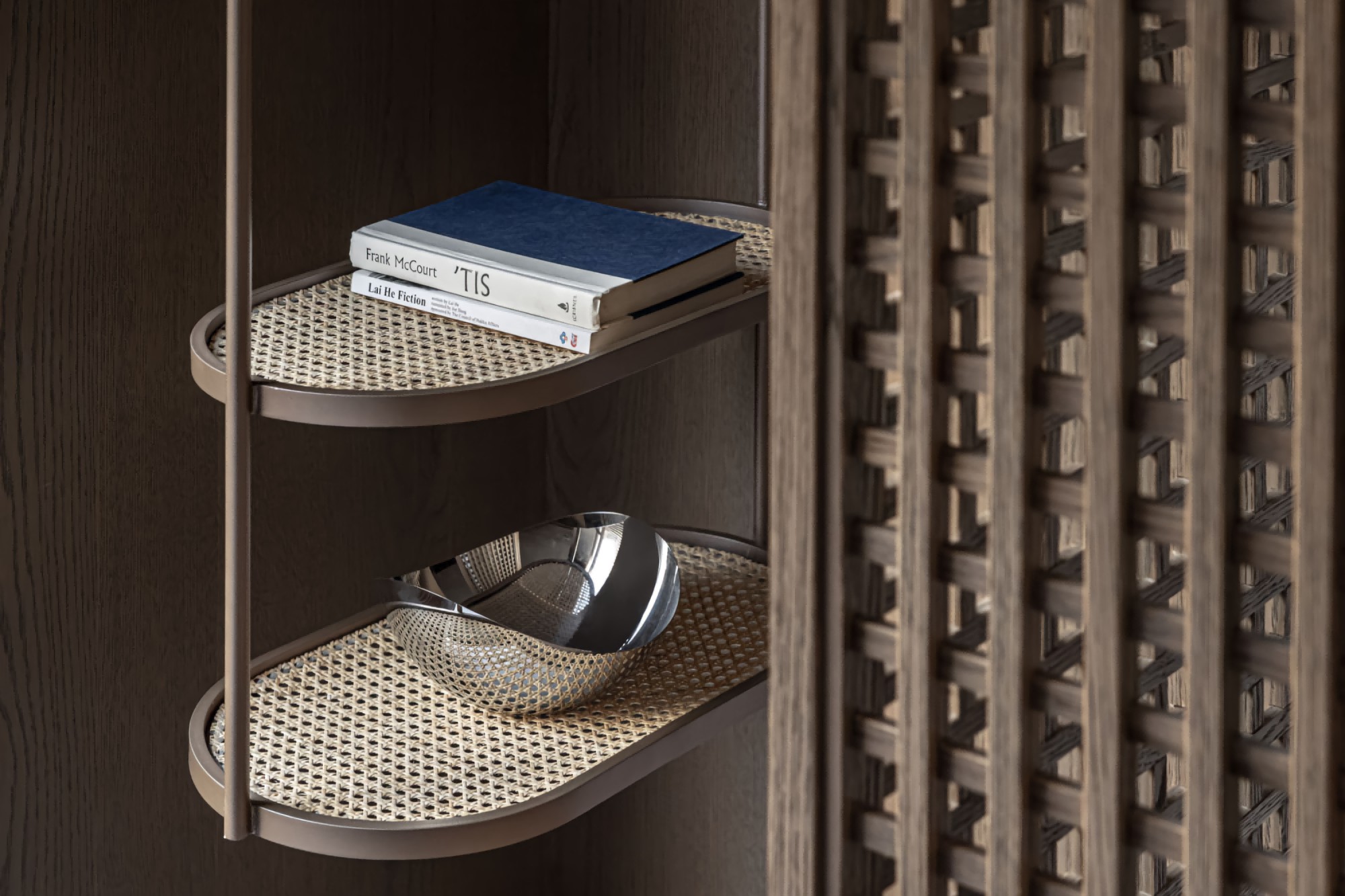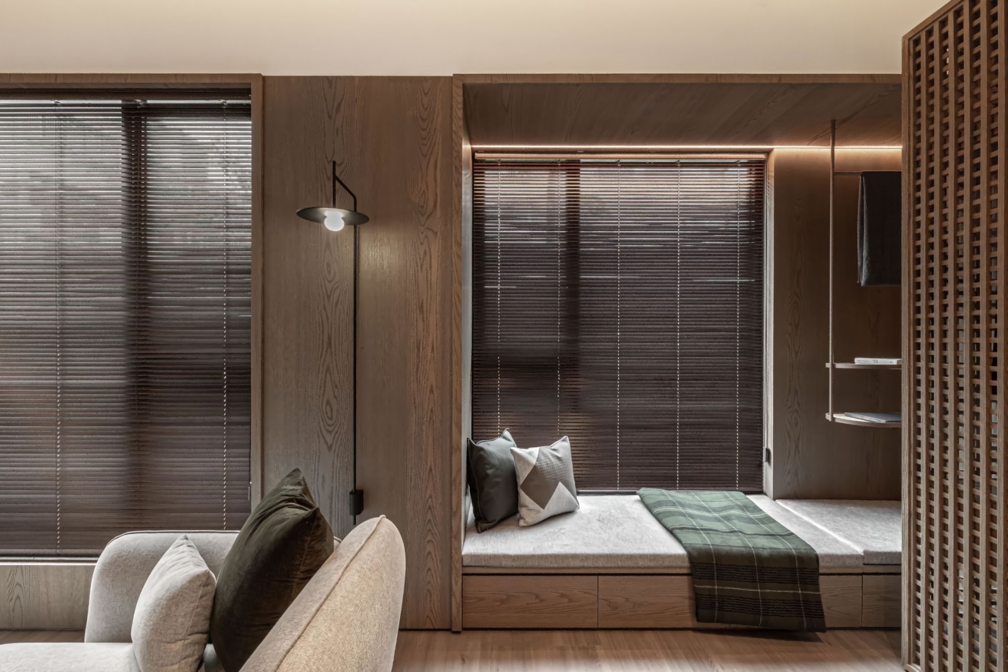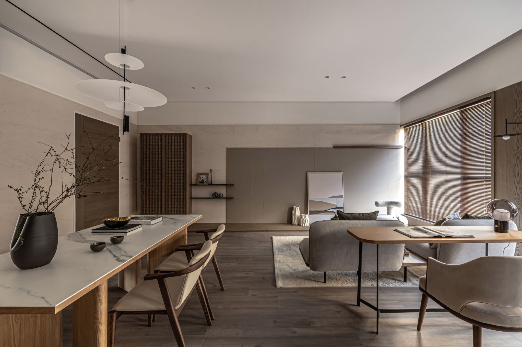 • 客餐厅:低饱和灰调软装+木质百叶窗,格栅隔断既通透又划分区域;软装线条柔和,自带松弛氛围感