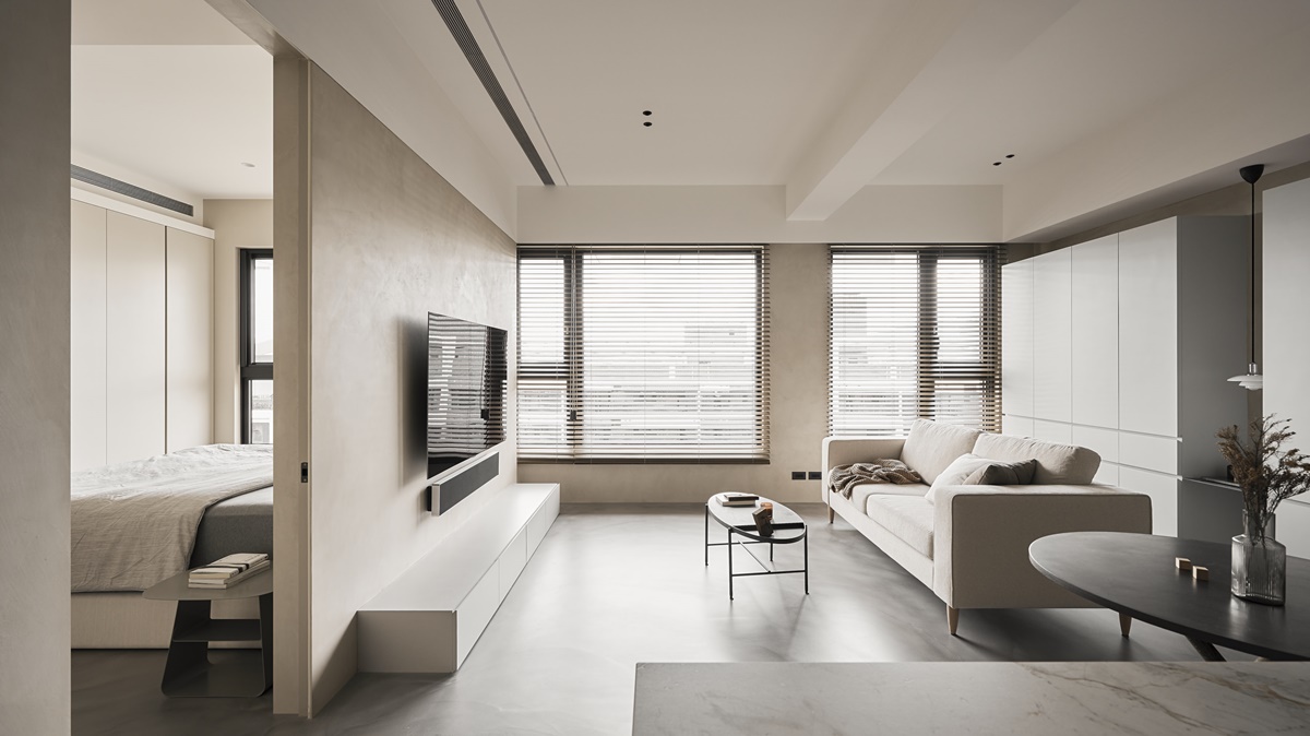 • 客厅:浅卡其艺术涂料墙+水泥灰地面,弱化空间边界;无主灯+磁吸轨道灯+筒灯分层布光,柔和不刺眼;整面百叶窗既保证采光又能调节隐私,搭配悬浮电视柜+低矮沙发,视觉上更显开阔。