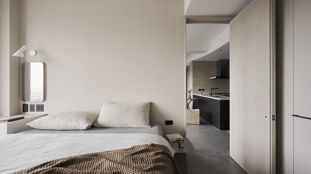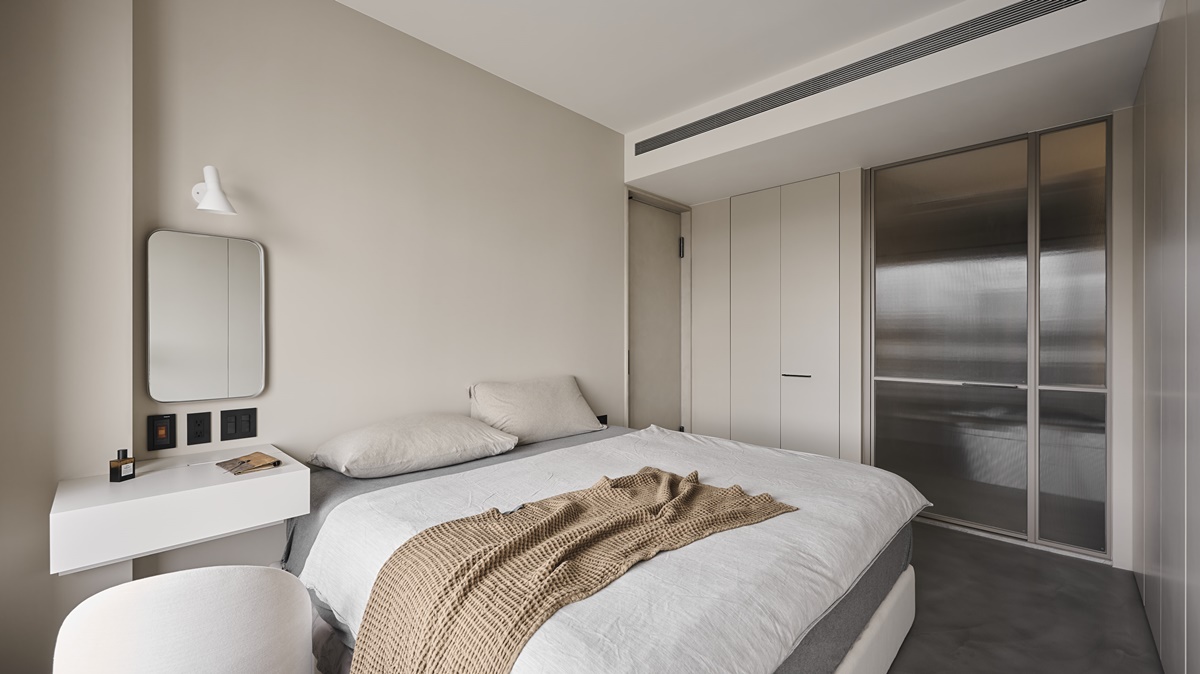 • 墙面延续浅米色基调,悬浮书桌+壁灯打造极简梳妆区;床品选亚麻肌理面料,叠搭针织毯增加温暖感;