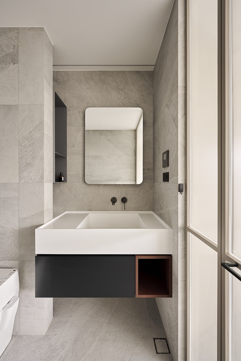 • 墙地通铺浅灰大理石纹瓷砖,提升高级感;悬浮台盆+嵌入式壁龛,减少卫生死角;