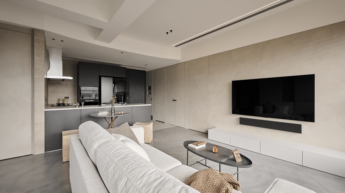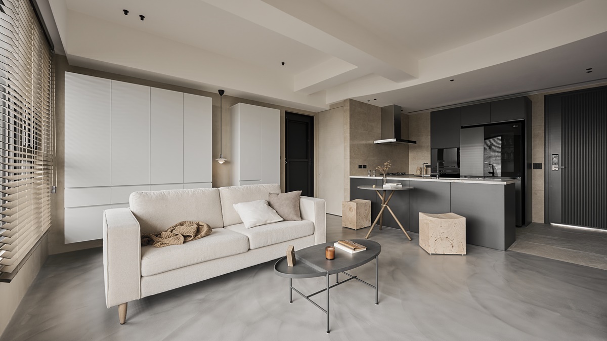 这套空间是**“极简侘寂+现代功能”**的融合设计,从公区到私域都藏着细腻的巧思: