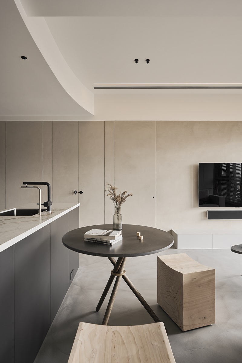 • 餐厨区:弧形吊顶柔化空间棱角,深色橱柜与浅米色墙面形成低调对比;岛台配原木墩坐凳,增加自然质感;隐形门与墙面同色,让动线更流畅。