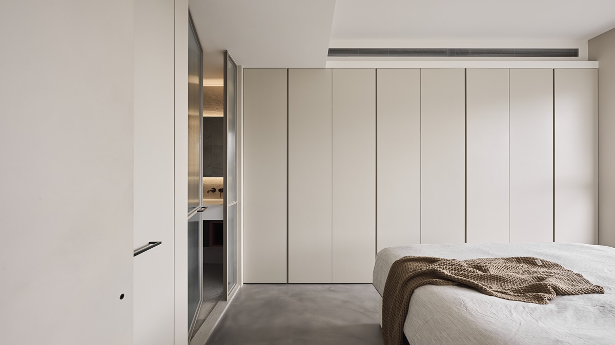 整体用低饱和色系、自然肌理材质(艺术涂料、亚麻、原木),加上隐形收纳、无主灯等设计,既保持了极简的克制,又藏着生活的温度。