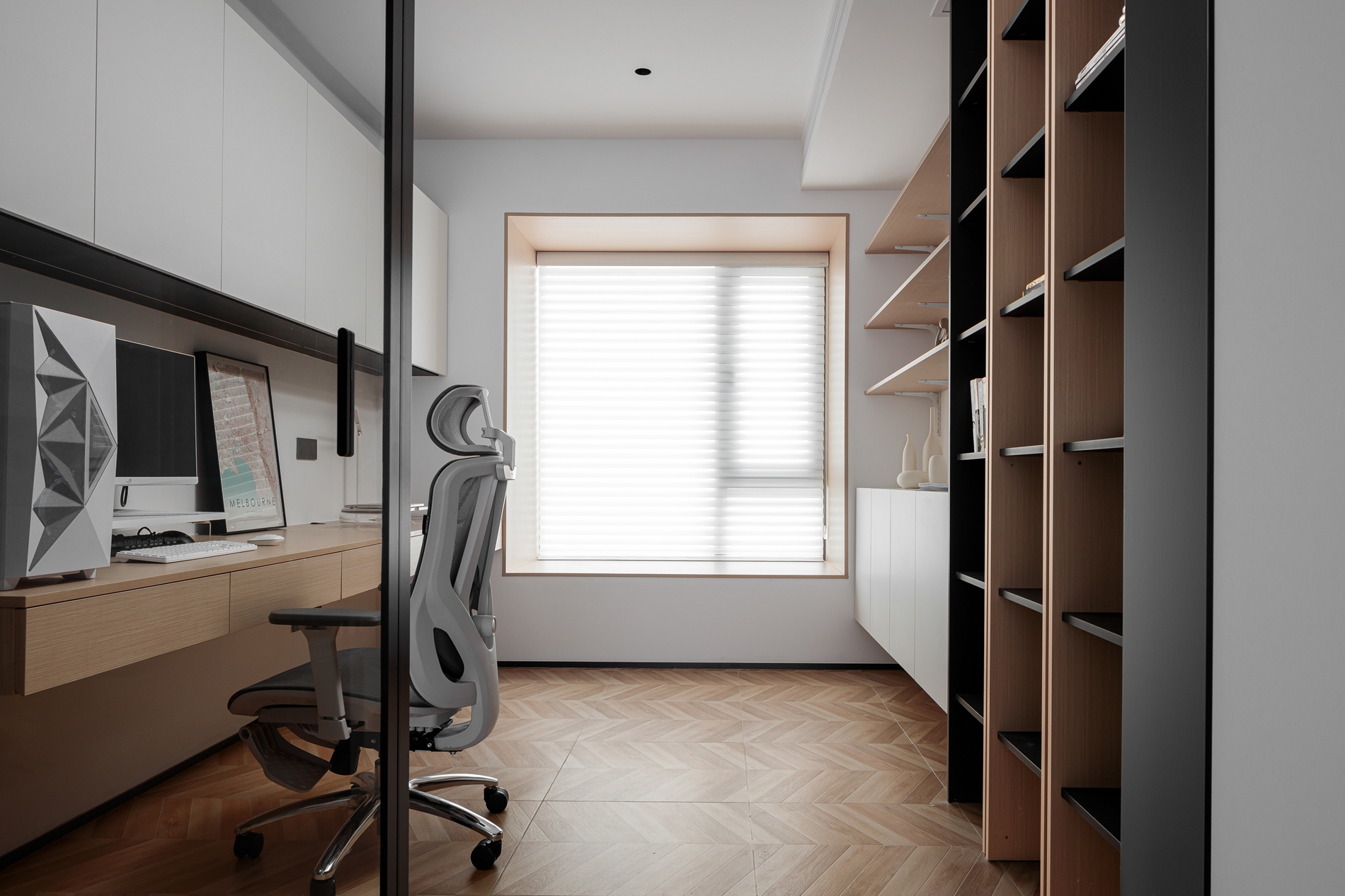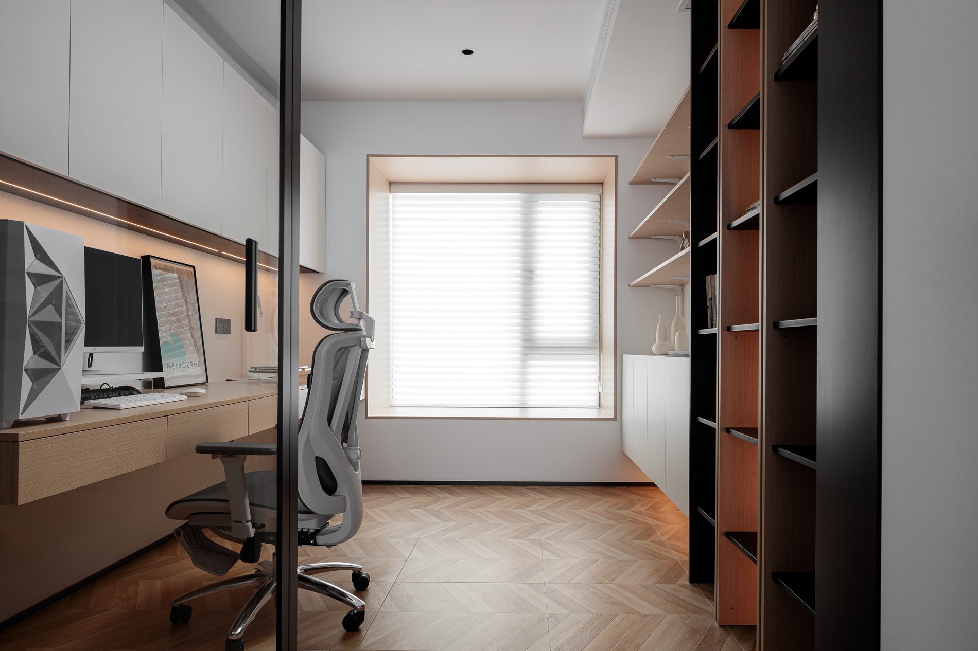 整面墙的悬浮书桌+吊柜,把收纳做到极致,灯光藏在柜底营造出柔和的工作氛围;旁边的开放式书架用“黑+木”撞色,既显层次又能展示摆件;百叶窗能灵活调节光线,搭配人体工学椅,哪怕长时间办公也不会觉得压抑——这个空间把“实用”和“美学”平衡得刚好。
