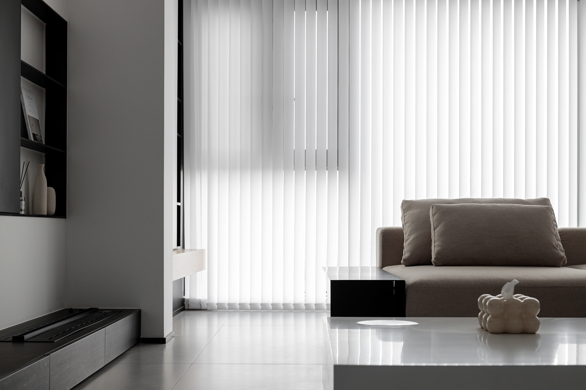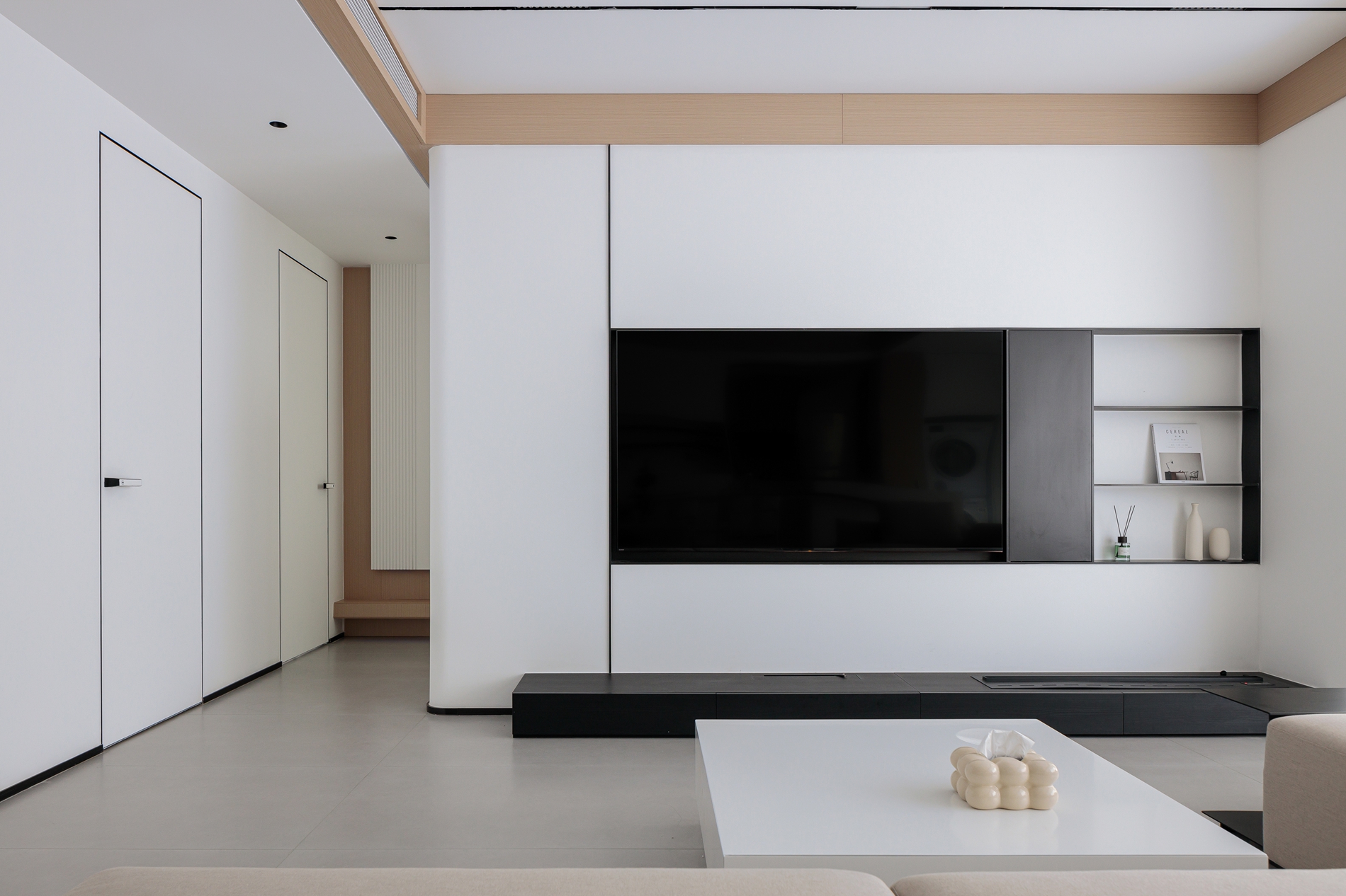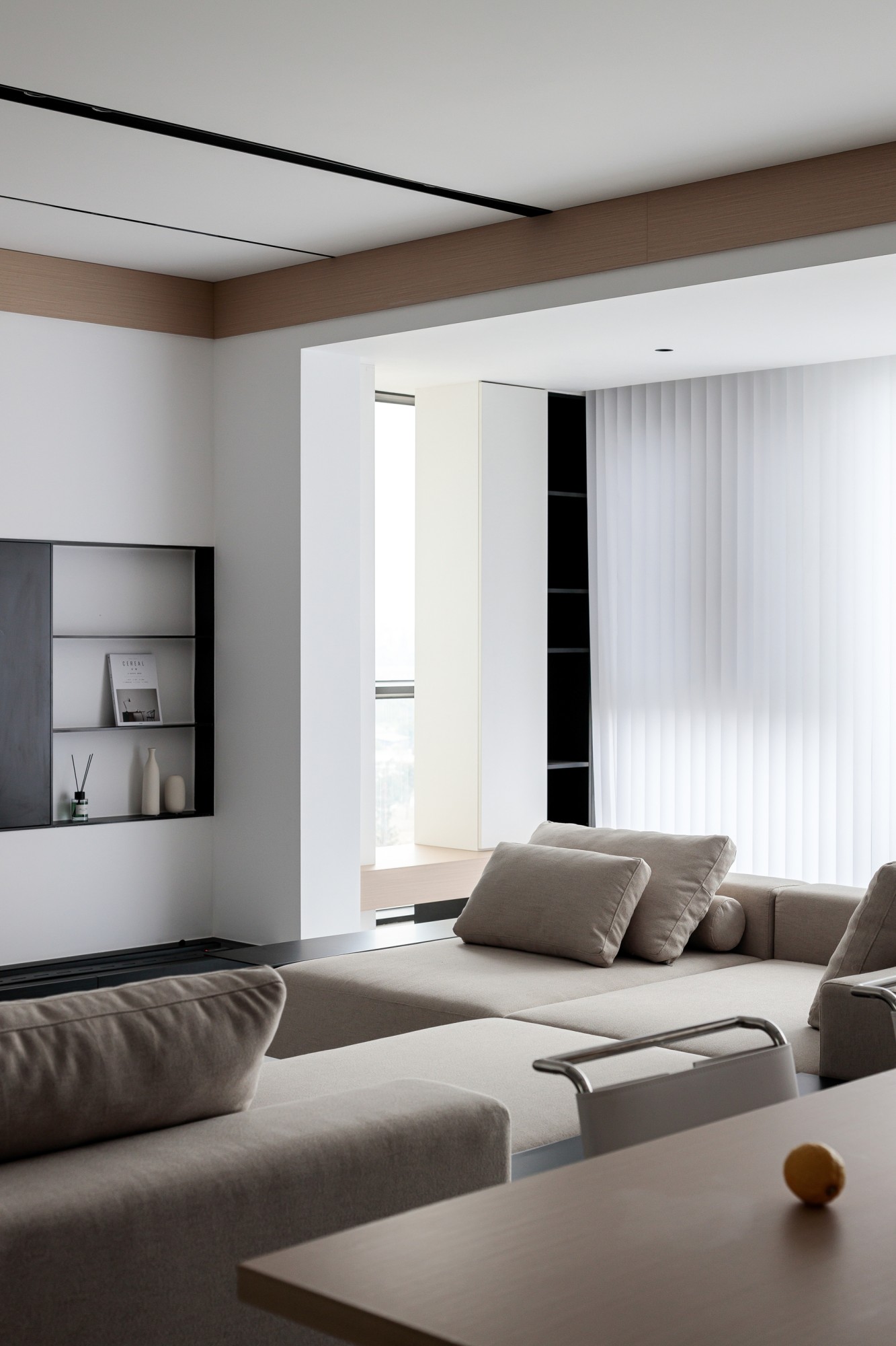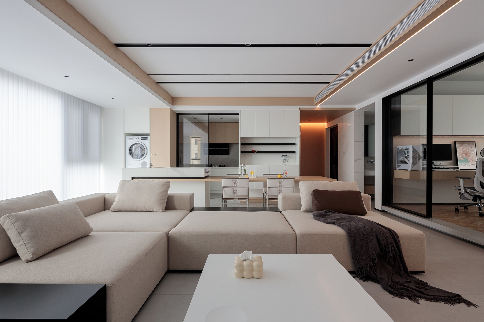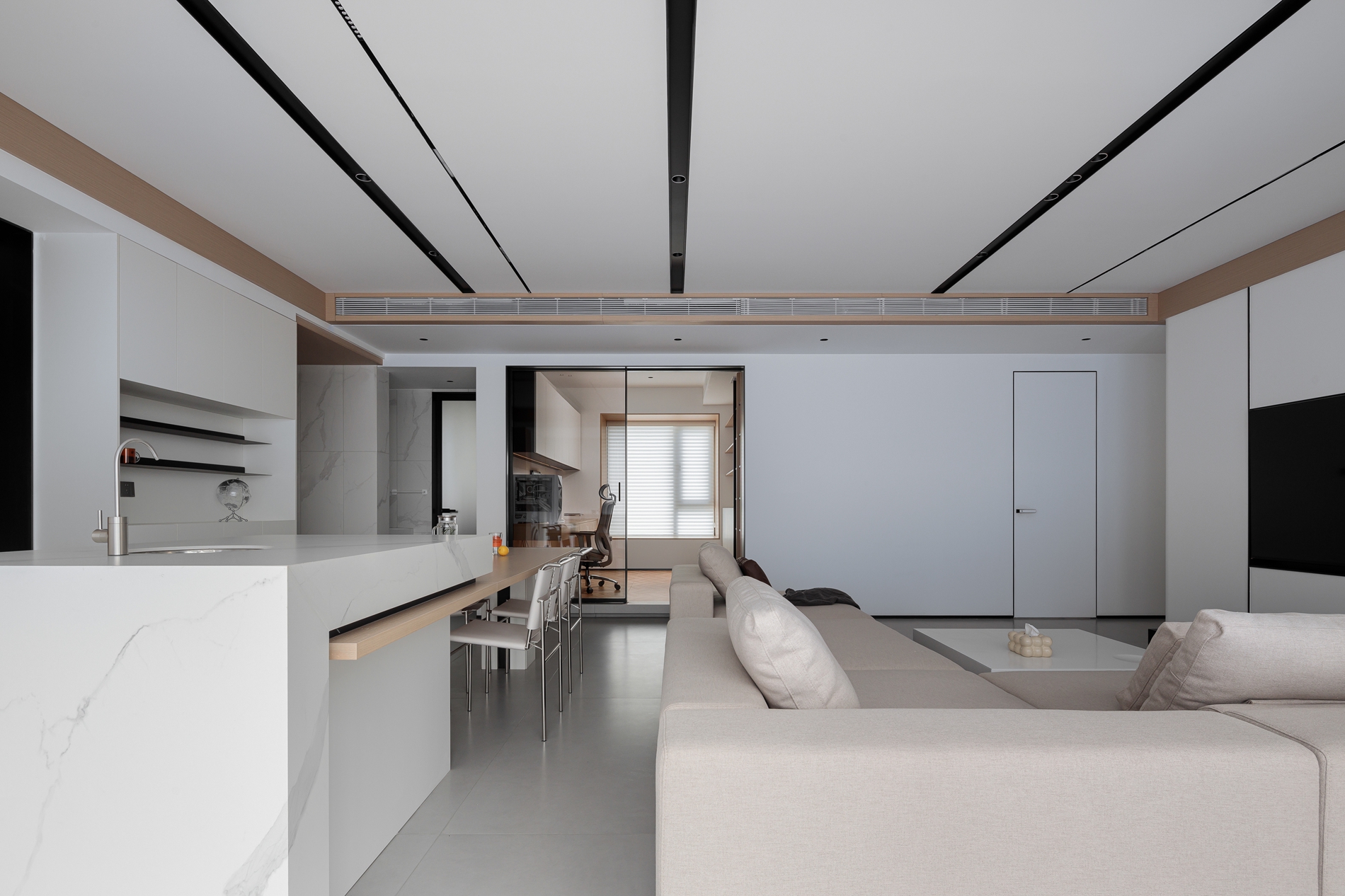 浅卡其L型沙发+白色岩板茶几,用低饱和色系铺出柔和基底,搭一条深灰毛毯增加层次;电视墙做了“悬浮柜体+嵌入式电视”,黑色开放格点缀摆件,下方长形地台藏住线路;顶面的黑色线性灯+木色吊顶,和地面浅灰大砖形成“上轻下稳”的呼应;玻璃百叶帘把自然光柔化后铺满空间,和餐厨区的隔断设计让视线完全打通,整个公共区既开阔又显温馨。