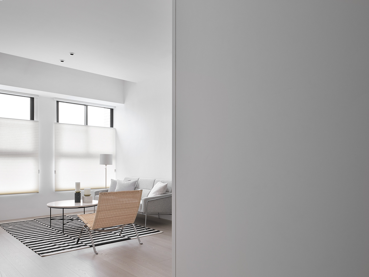 • 客厅:大面积白墙+浅木色地板,搭配浅灰沙发与黑白条纹地毯,既清爽又带点利落的线条感;隐藏式柜体+嵌入式家电,让视觉更整洁。