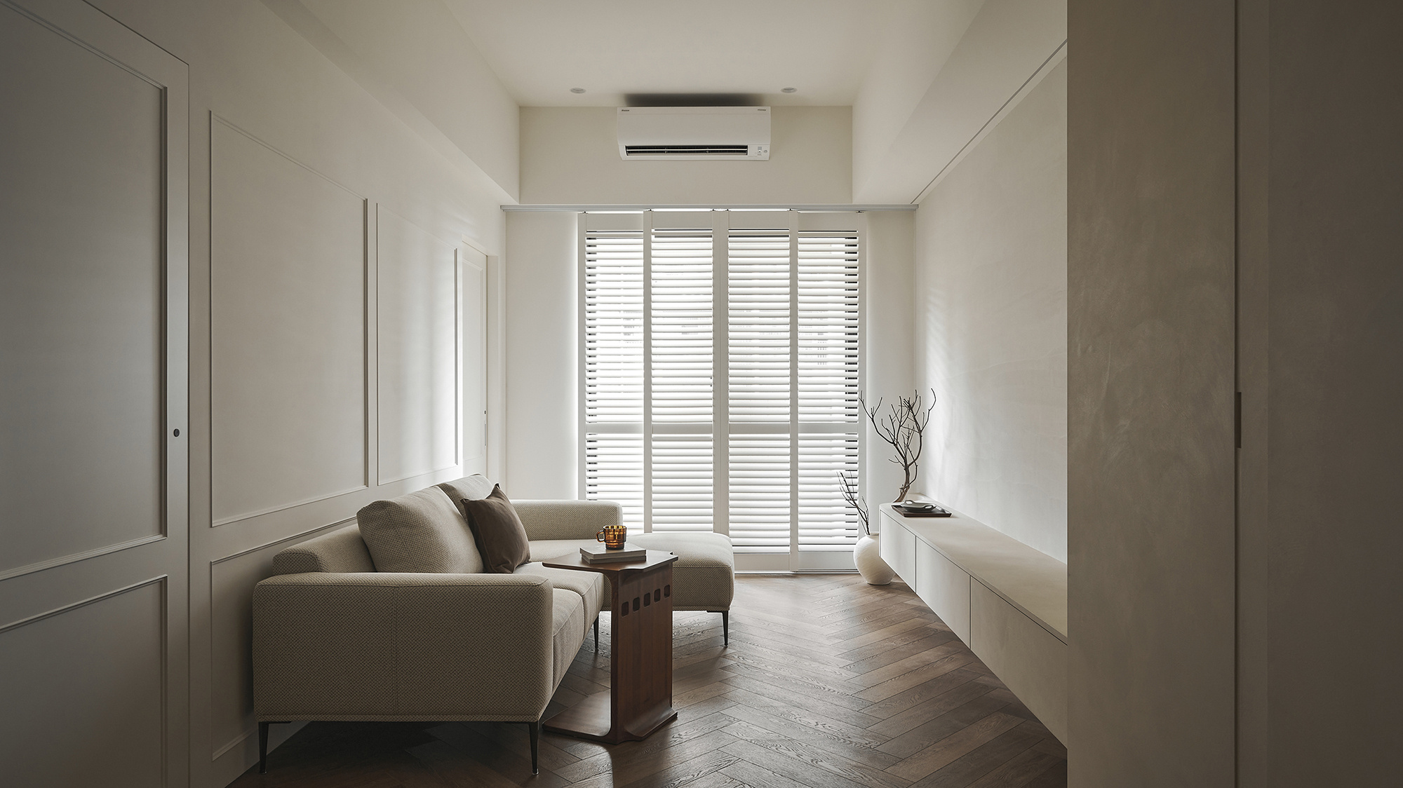 浅肌理墙面+人字拼木地板,搭配低饱和布艺沙发,弱化硬质线条; 通顶百叶窗柔化光线,局部置物柜+枯枝装饰平衡简约与温度。