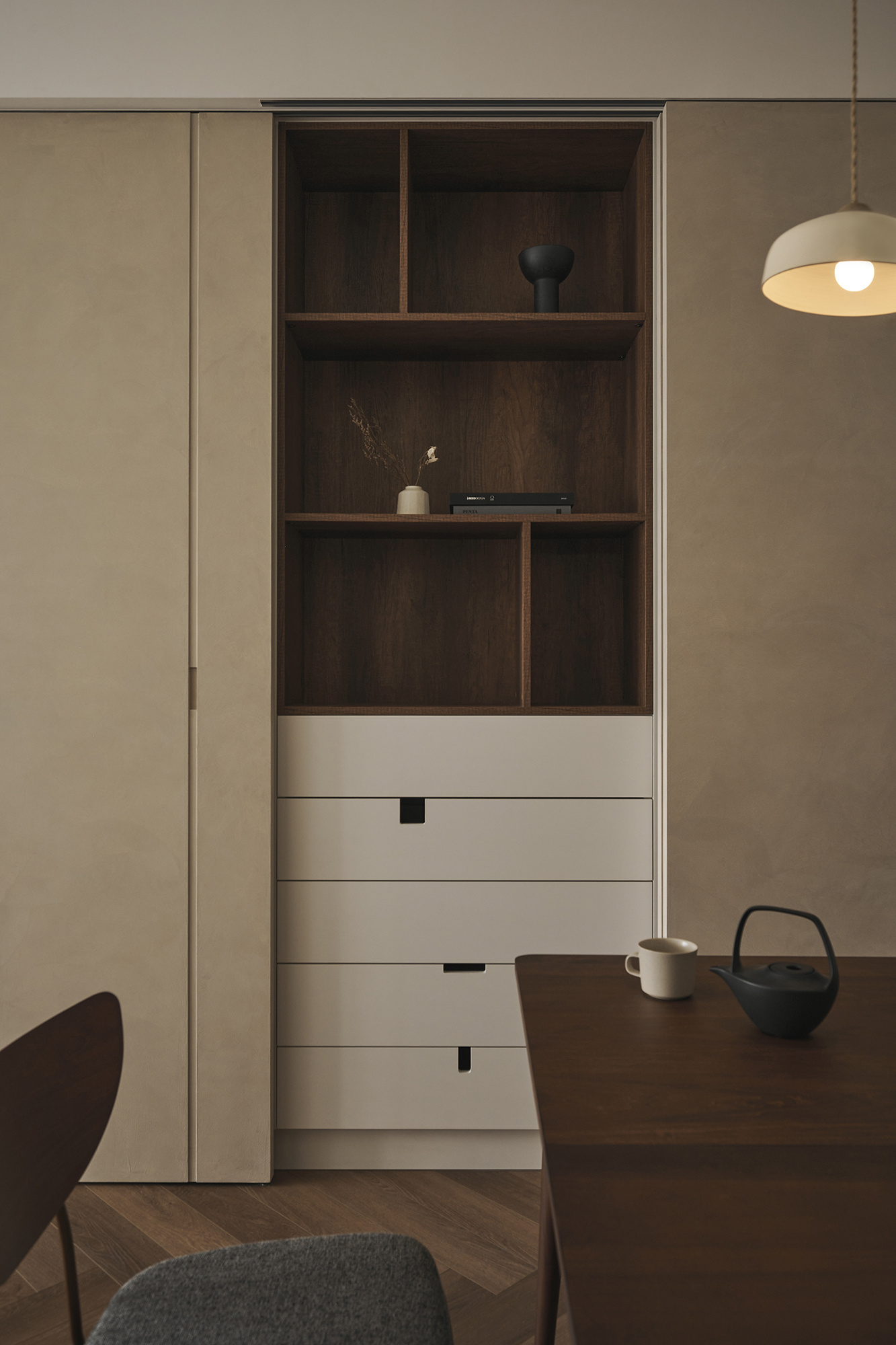 这是一套暖调极简风住宅,以浅米色、木色为主调,通过统一材质与隐形式设计营造柔和松弛的氛围,:
