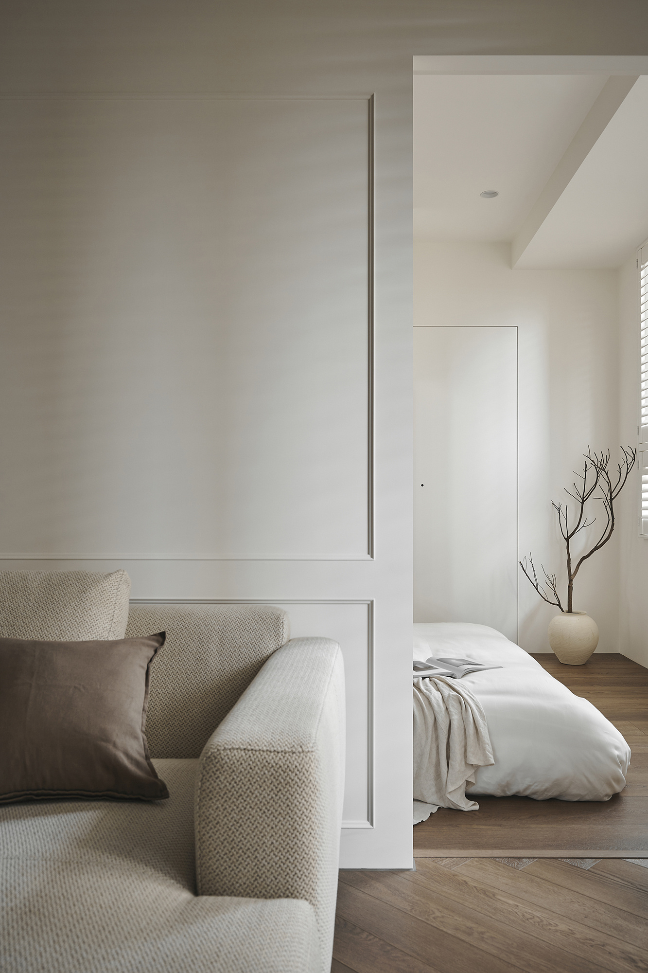 整面定制柜+隐形门设计,最大化利用空间;局部木质格栅床头+嵌入式灯光,在极简中增加温馨细节,百叶窗保证隐私同时引入自然光。
