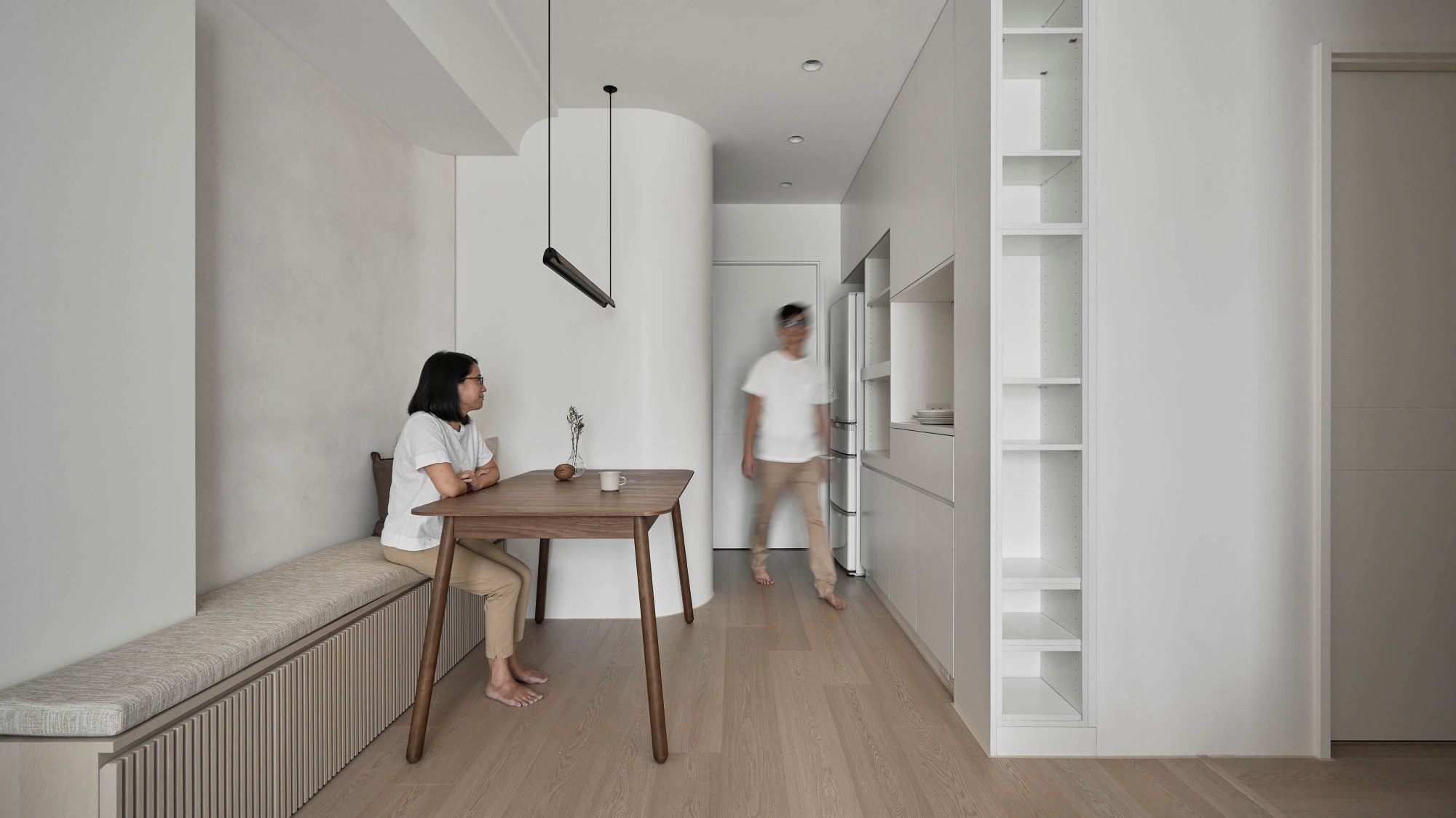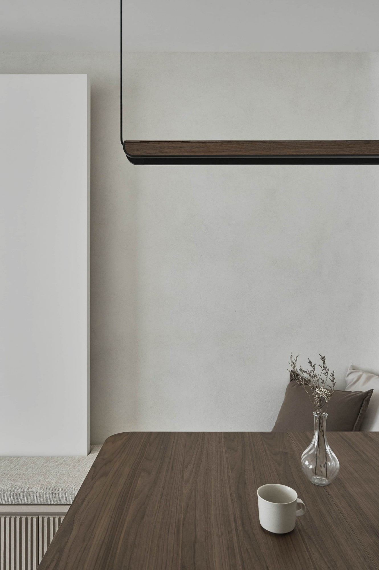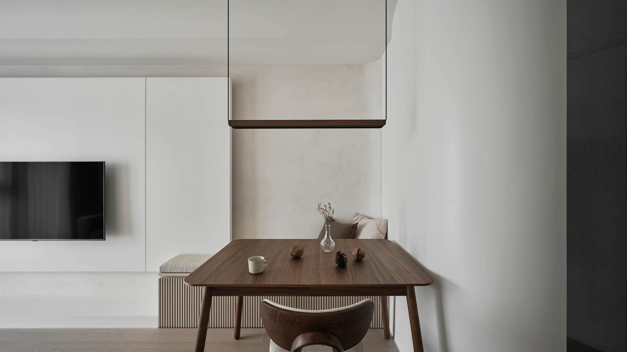 • 餐厨区:胡桃木餐桌和弧形吊顶刚柔相济,卡座藏着收纳,几颗松果、一杯咖啡就把“松弛感”写在了桌上,连墙面肌理都在悄悄柔化边界。