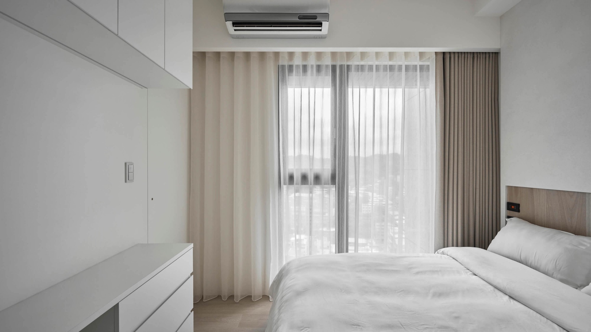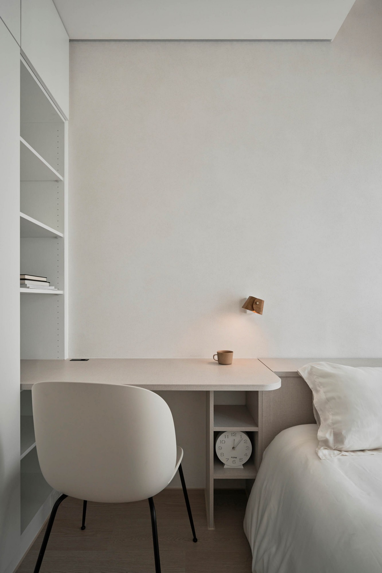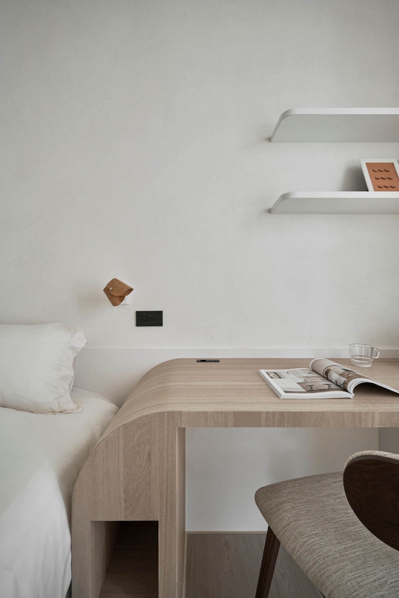 • 卧室:三层窗帘滤出朦胧的窗景,悬浮柜+木饰面床头让空间“轻”下来,全白床品裹着蓬松的软,躺下就是被温柔裹住的安全感。