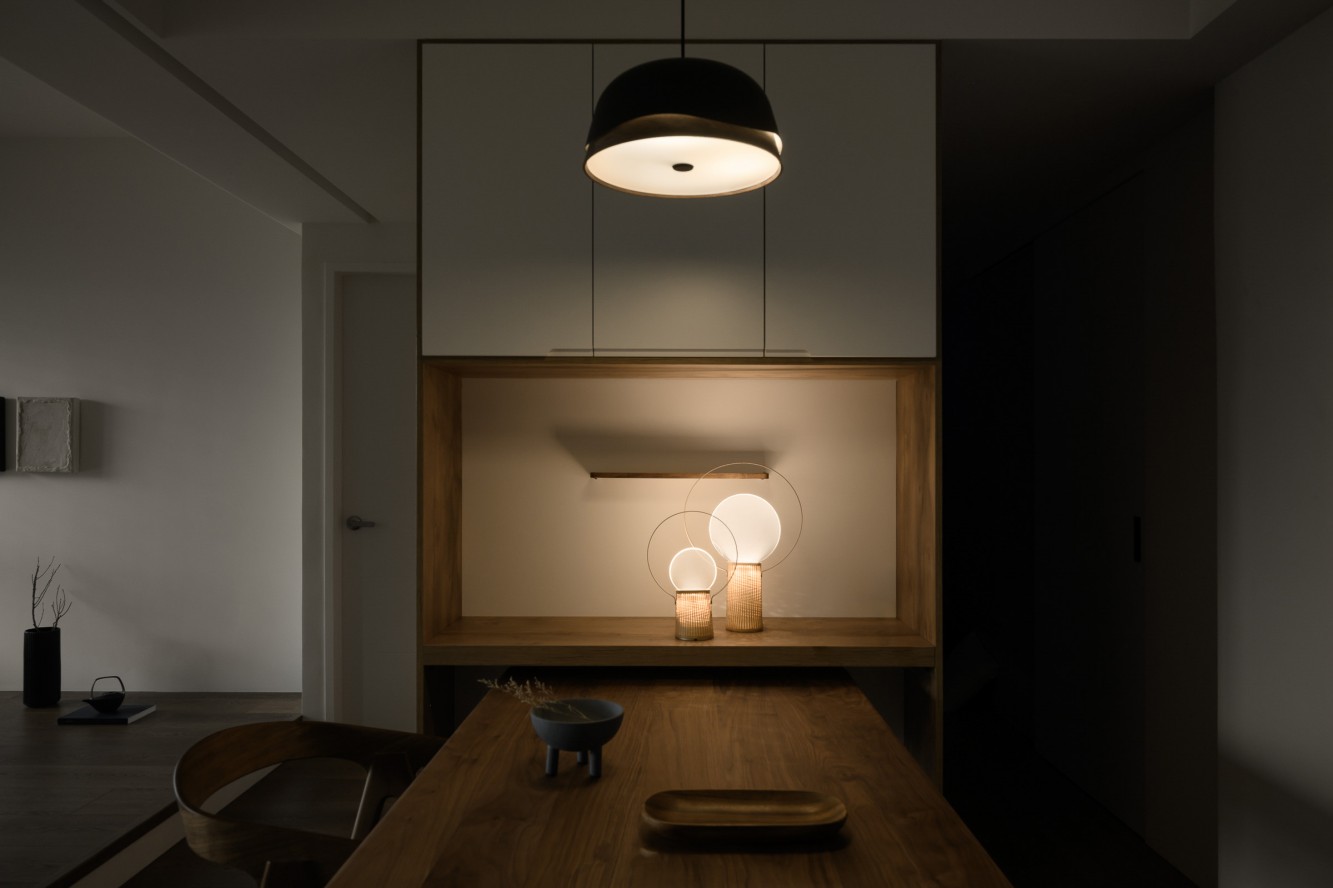 • 餐厨区:暖光把木色衬得更温柔,藏在柜体里的展示台像个小剧场,连摆件都裹着朦胧的光晕,夜晚亮起灯就是治愈的小世界。