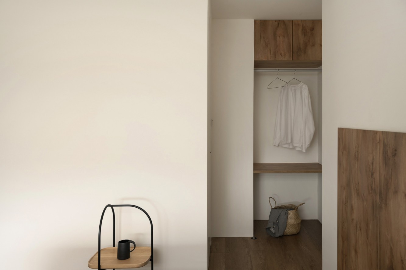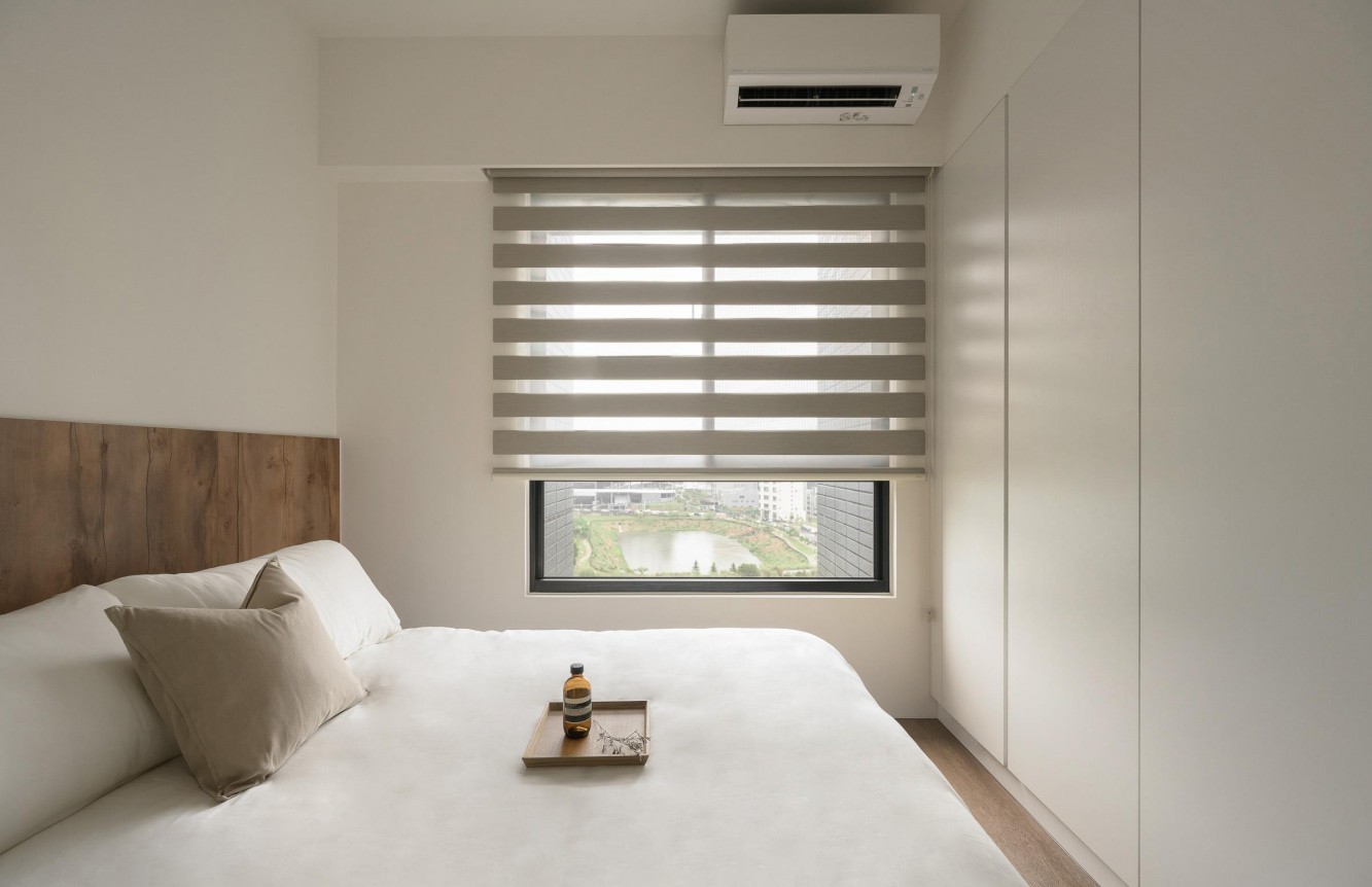 • 卧室:木饰面床头揉进软白床品,百叶窗滤出窗外的湖景,连托盘里的小瓶都带着“不赶时间”的慵懒,躺下就是被温柔接住的安全感。