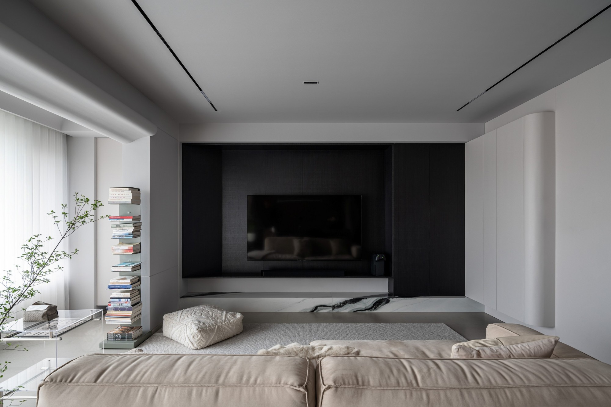 • 客厅:浅褐绒面沙发裹着柔软,黑色背景墙+悬浮电视柜衬出利落,玻璃书架叠着书籍,让极简多了份生活的温度;顶线暗藏灯带,柔化了空间的冷硬感。