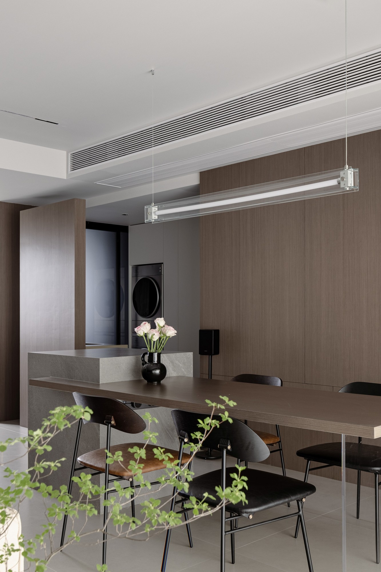 • 餐厅:木饰面墙+水泥质感岛台,自带沉静的侘寂氛围;透明吊灯+亚克力置物架,用“轻透感”让空间不沉闷,几株绿植是点睛的鲜活。