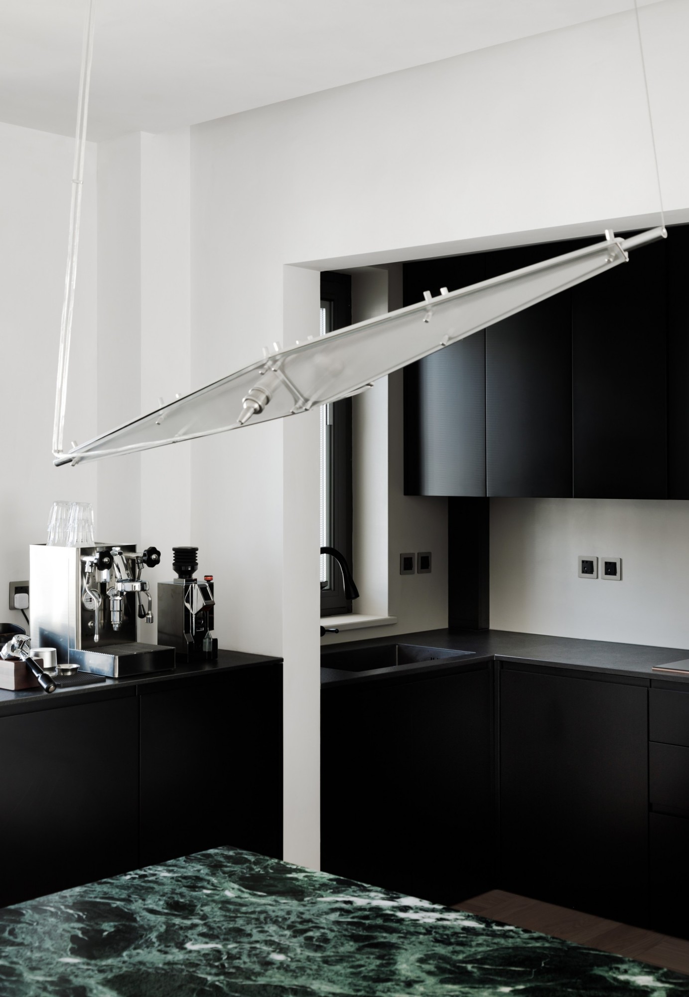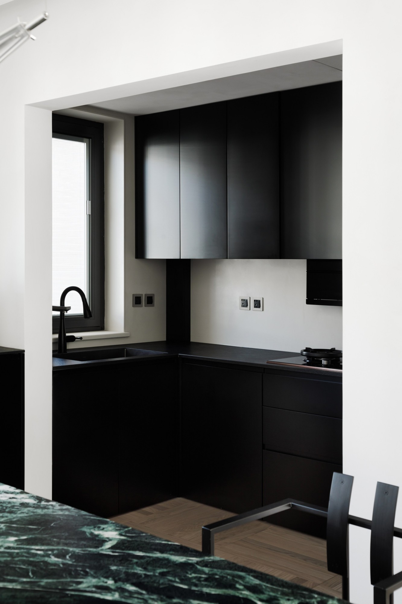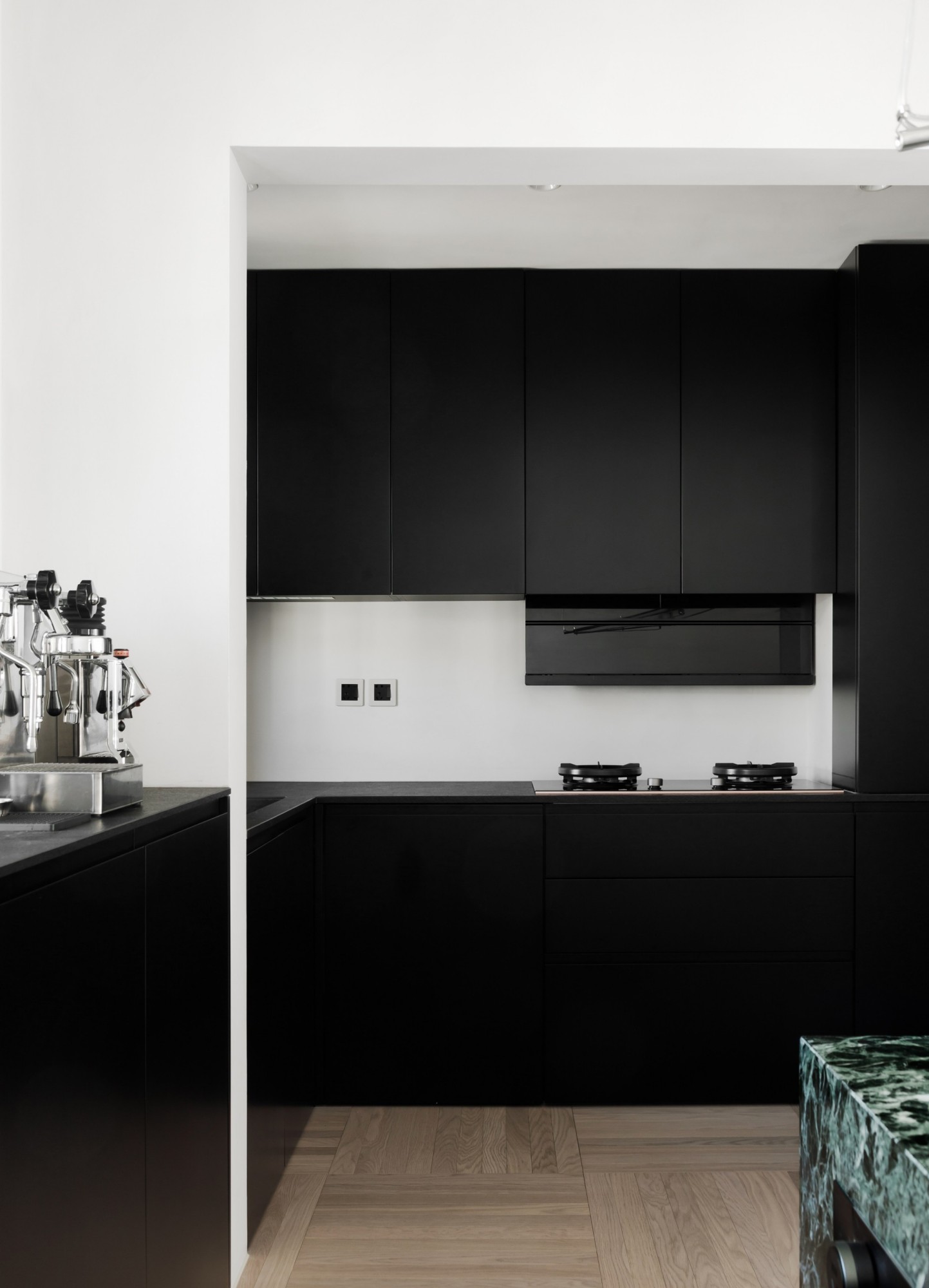 • 厨房是全黑哑光橱柜,无把手设计+隐藏式电器,把“极简”贯彻到底,旁边的银色咖啡机又添了点冷调精致感;