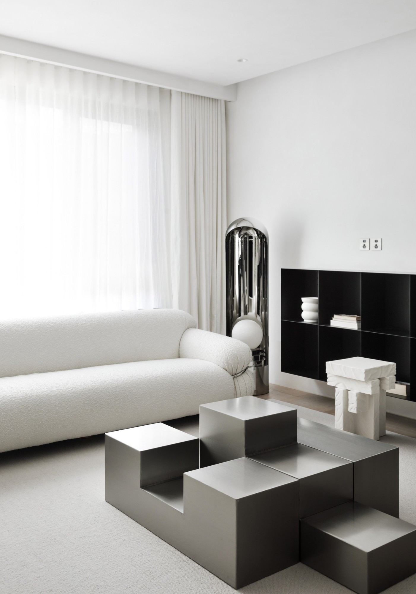• 家具选了奶油白软包沙发(圆润的泡芙式扶手自带松弛感),搭配几何拼接的金属茶几(黑白块面撞出利落线条),旁边的黑色模块置物架既当收纳又做装饰,摆上雕塑感摆件后更显精致;