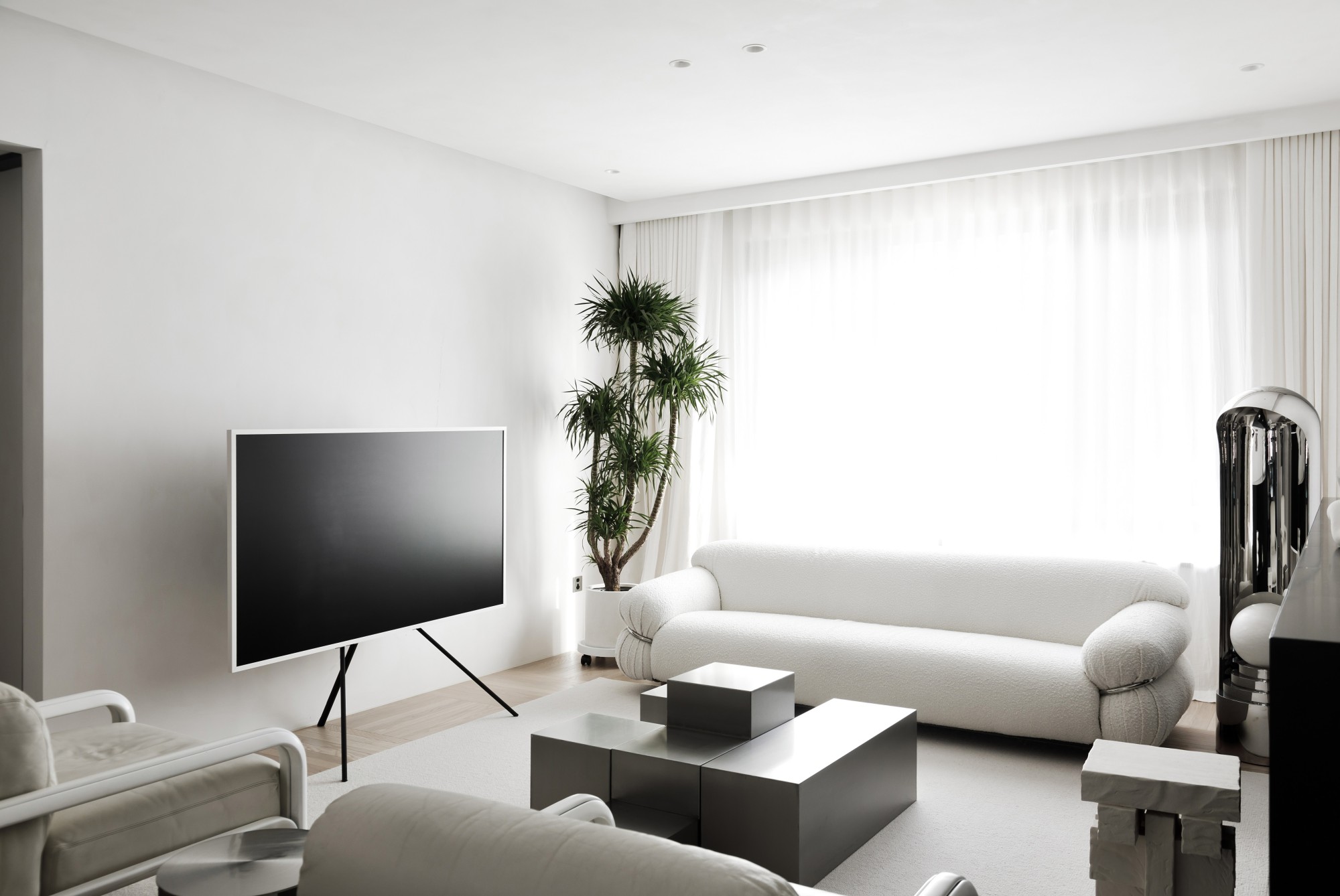 • 细节藏在“呼吸感”里:落地的龙血树带点热带松弛,银色艺术落地灯像流动的金属,和极简电视形成冷硬与柔和的对比。
