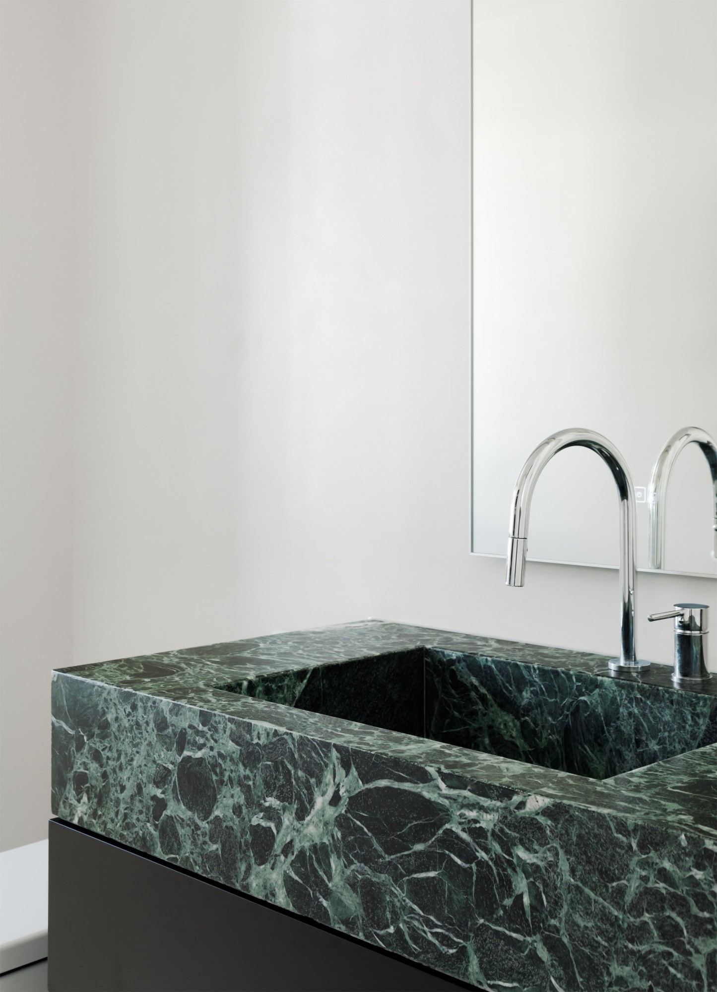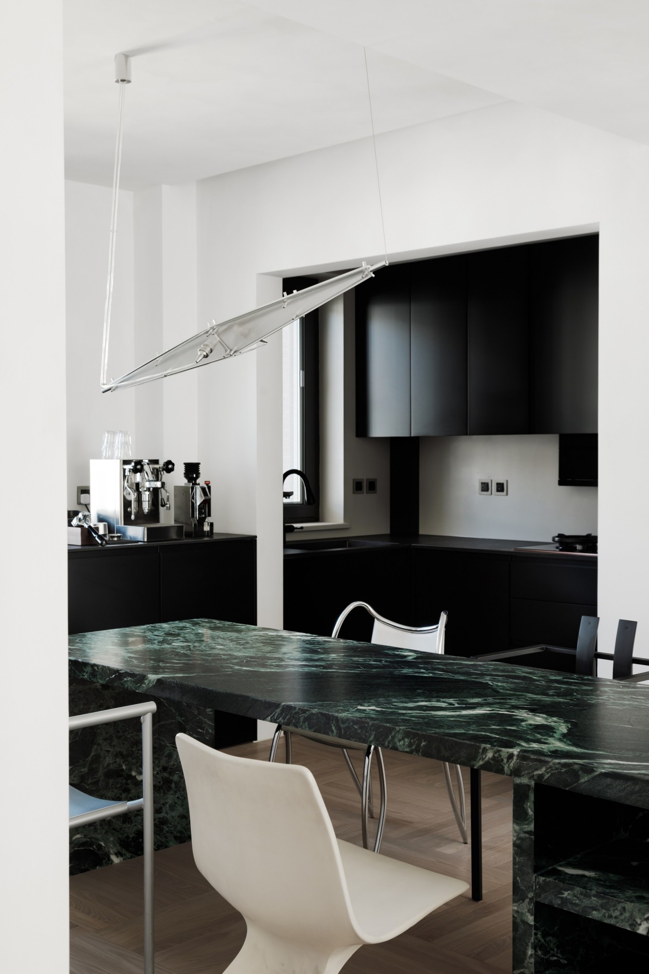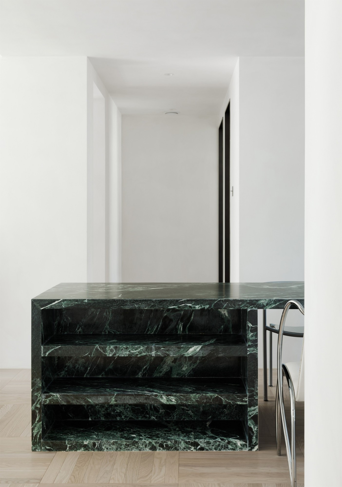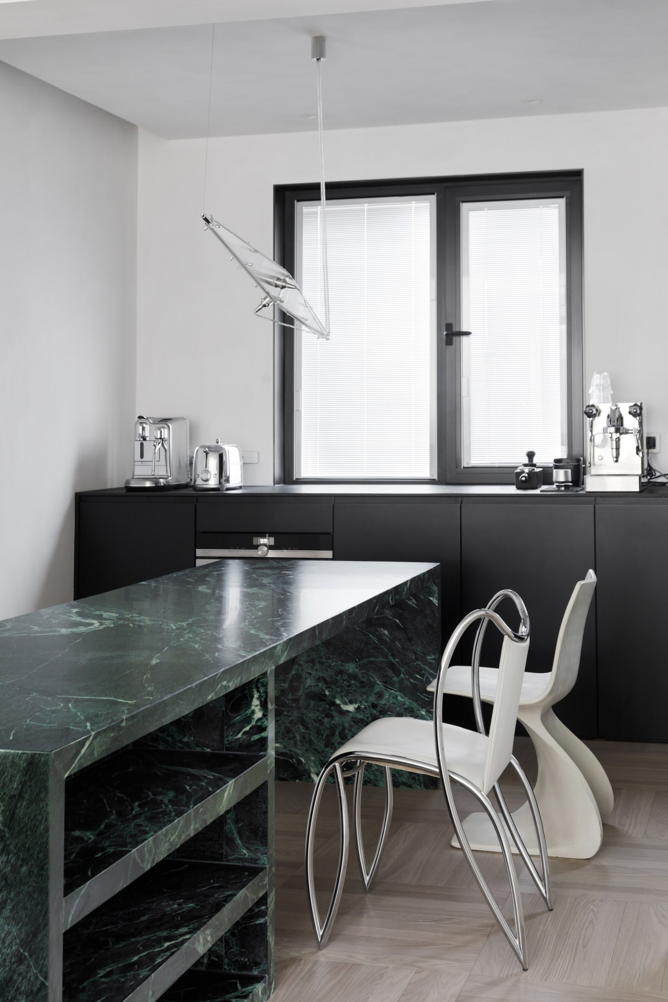 • 岛台/餐桌是核心:用一整块祖母绿大理石(深绿底色+白色纹理)做台面,下方挖空的层板延续石材纹理,既当餐桌又能储物;