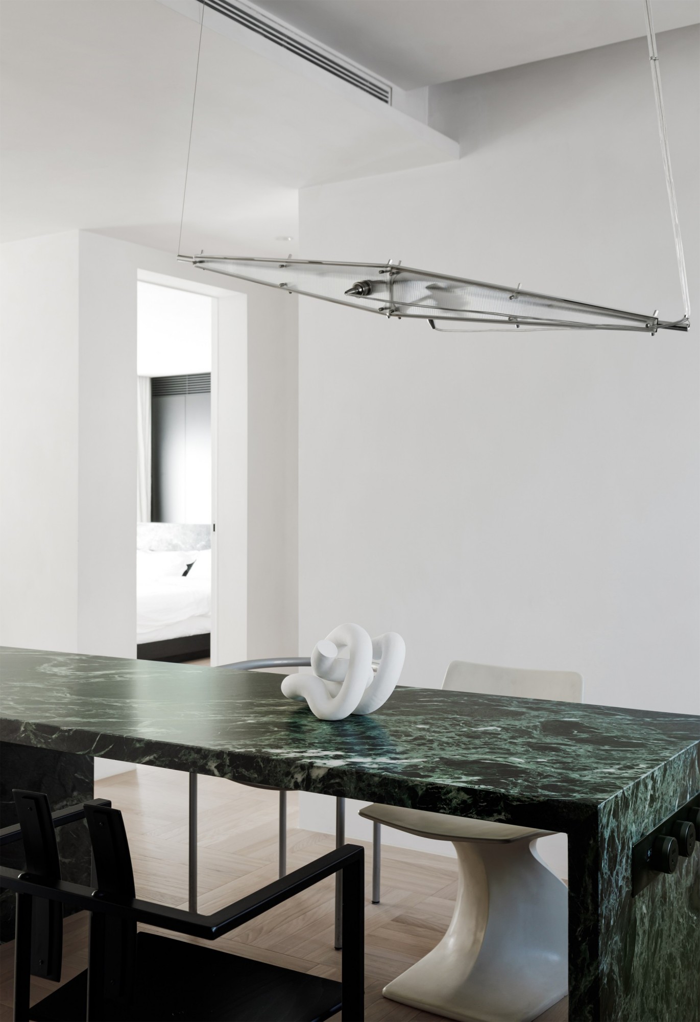 • 餐椅选了流线型金属框架+白色软包,轻盈的线条刚好中和了大理石的厚重。