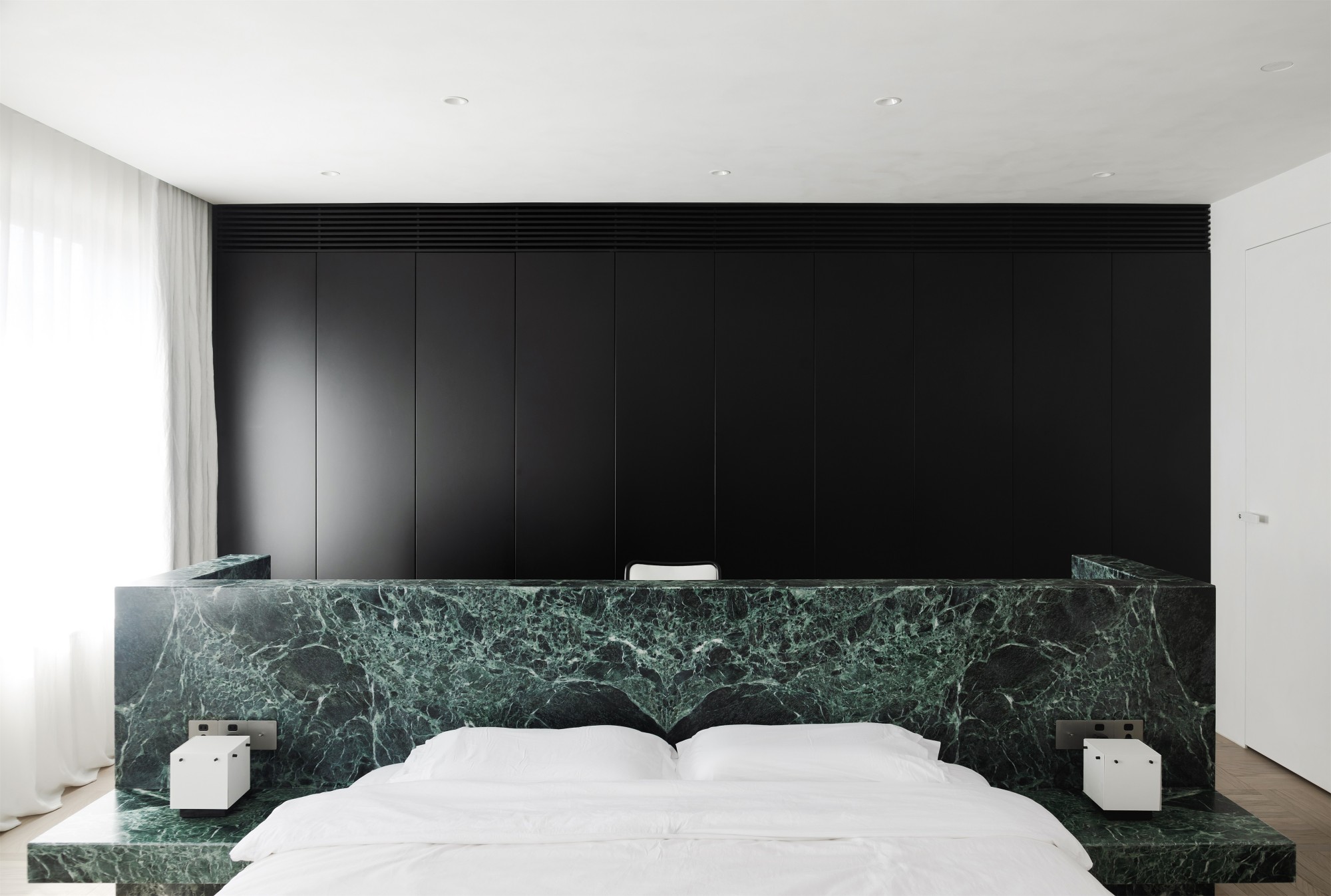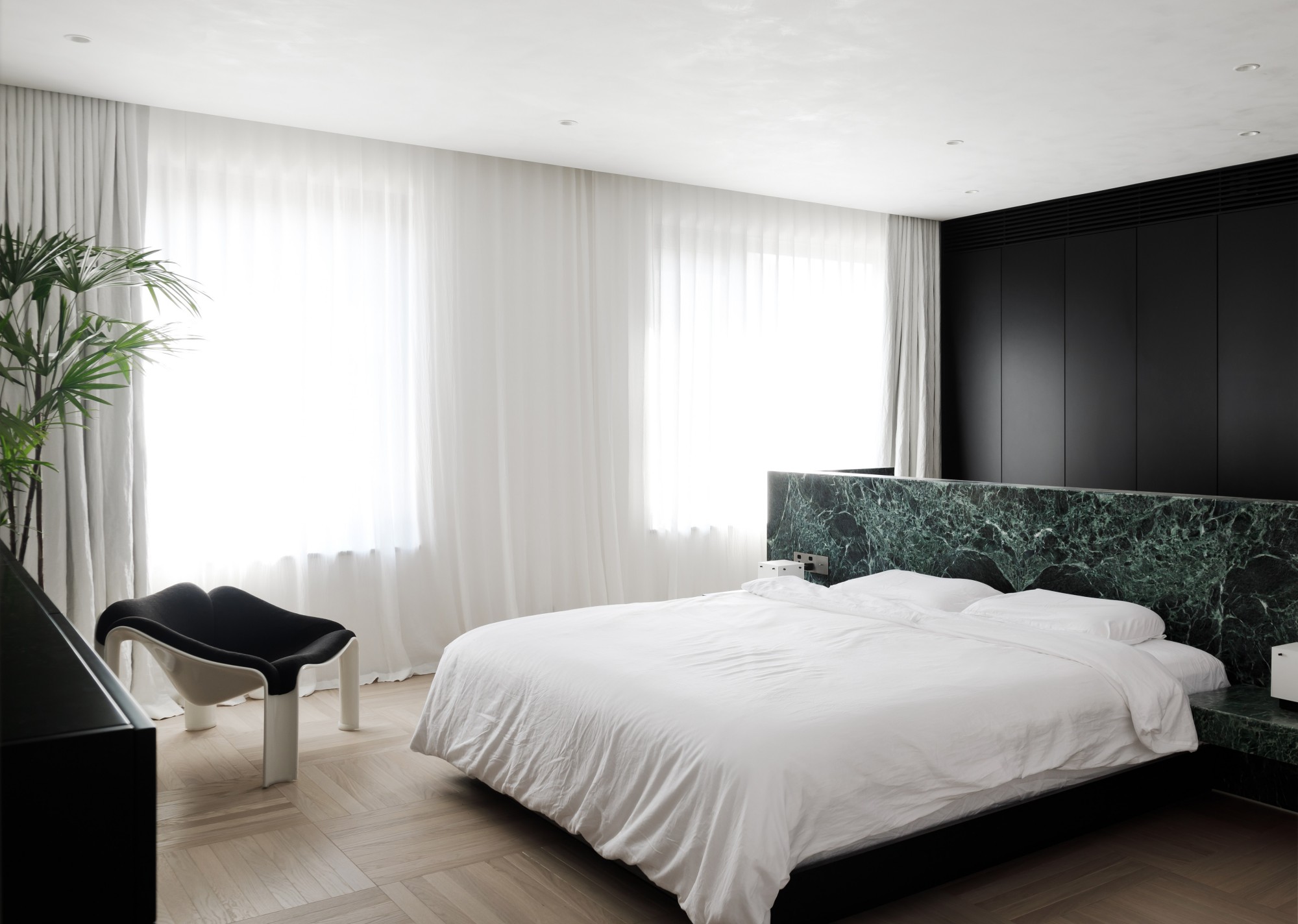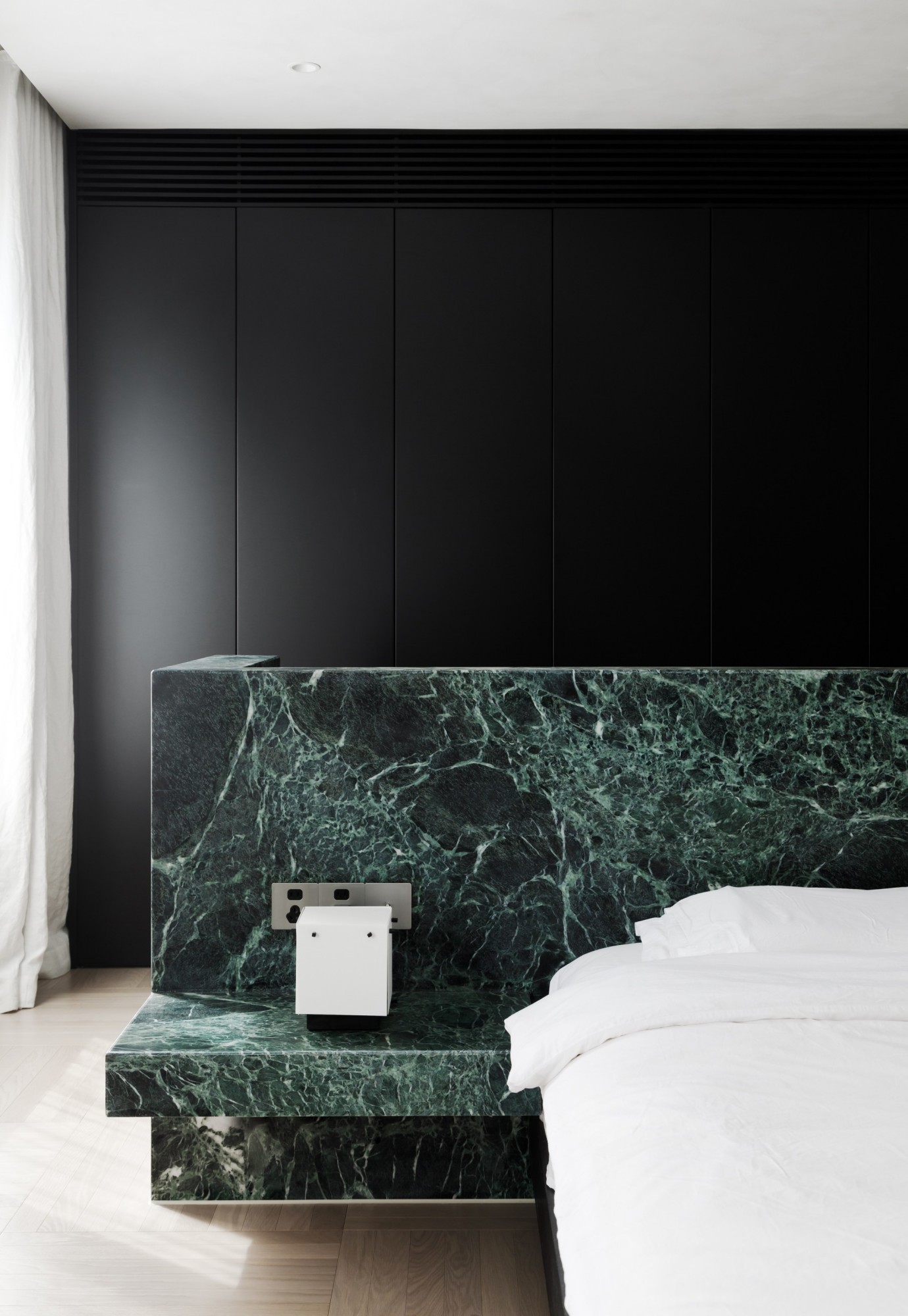 • 背景墙一半是黑色哑光护墙板(带隐形格栅,藏着通风细节),一半是祖母绿大理石床头,和客厅的奢石元素形成呼应;