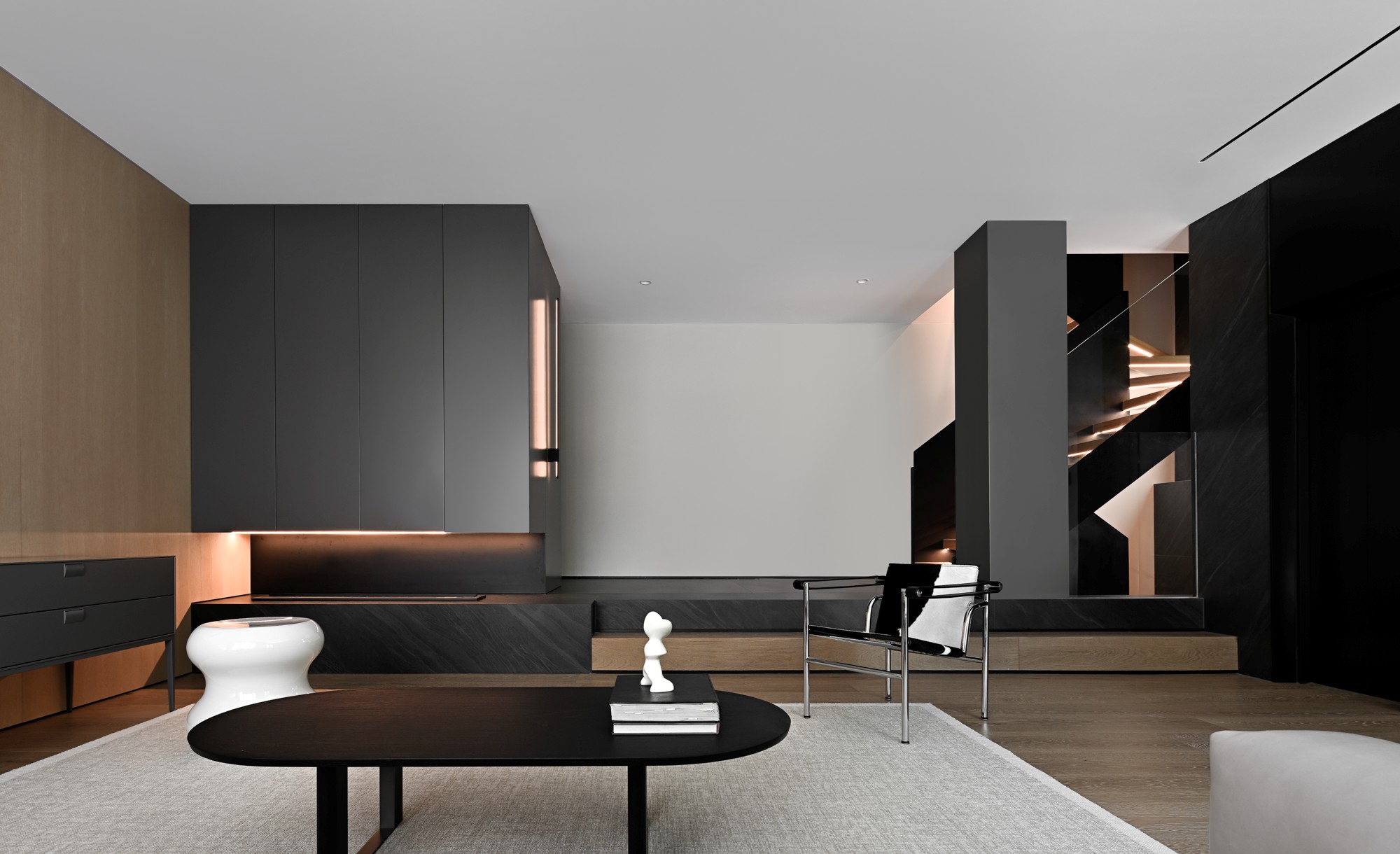 • 这是个低饱和暗调空间:深灰墙面+同色系地面,像把“安静”具象化了;