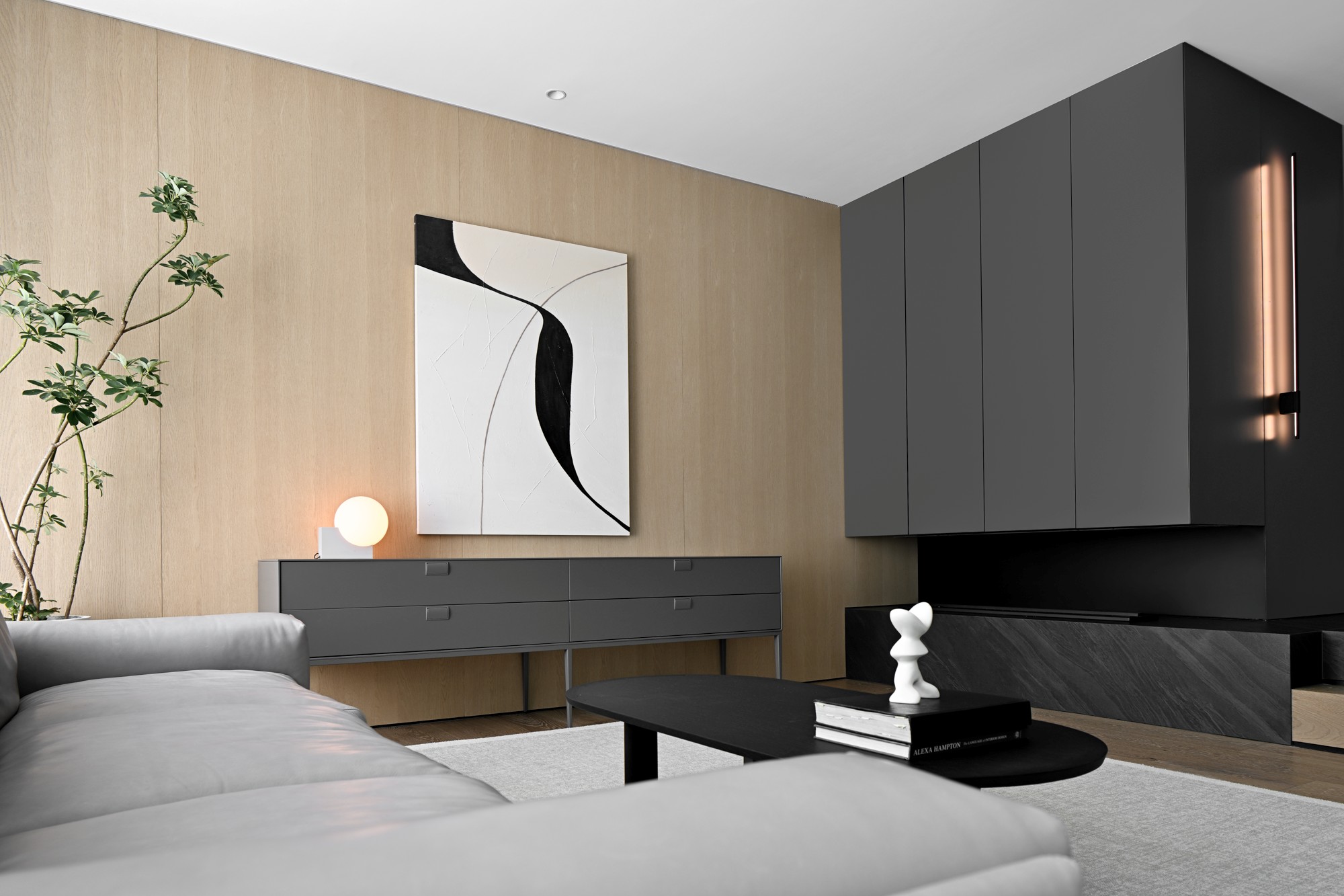 整个空间的妙处在于:用“暖木色”当温柔底色,用“黑灰冷调”做质感框架,再用“自然光线+艺术软装”当调味剂,既有极简的克制,又有生活的温度。
