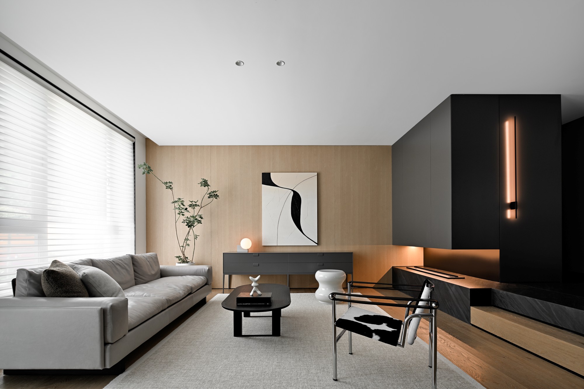 • 细节藏在“明暗对比”里:黑色隐形柜+嵌入式灯带,让极简空间多了点精致的层次感,百叶窗把自然光切得细碎,洒在木墙上像加了层滤镜。