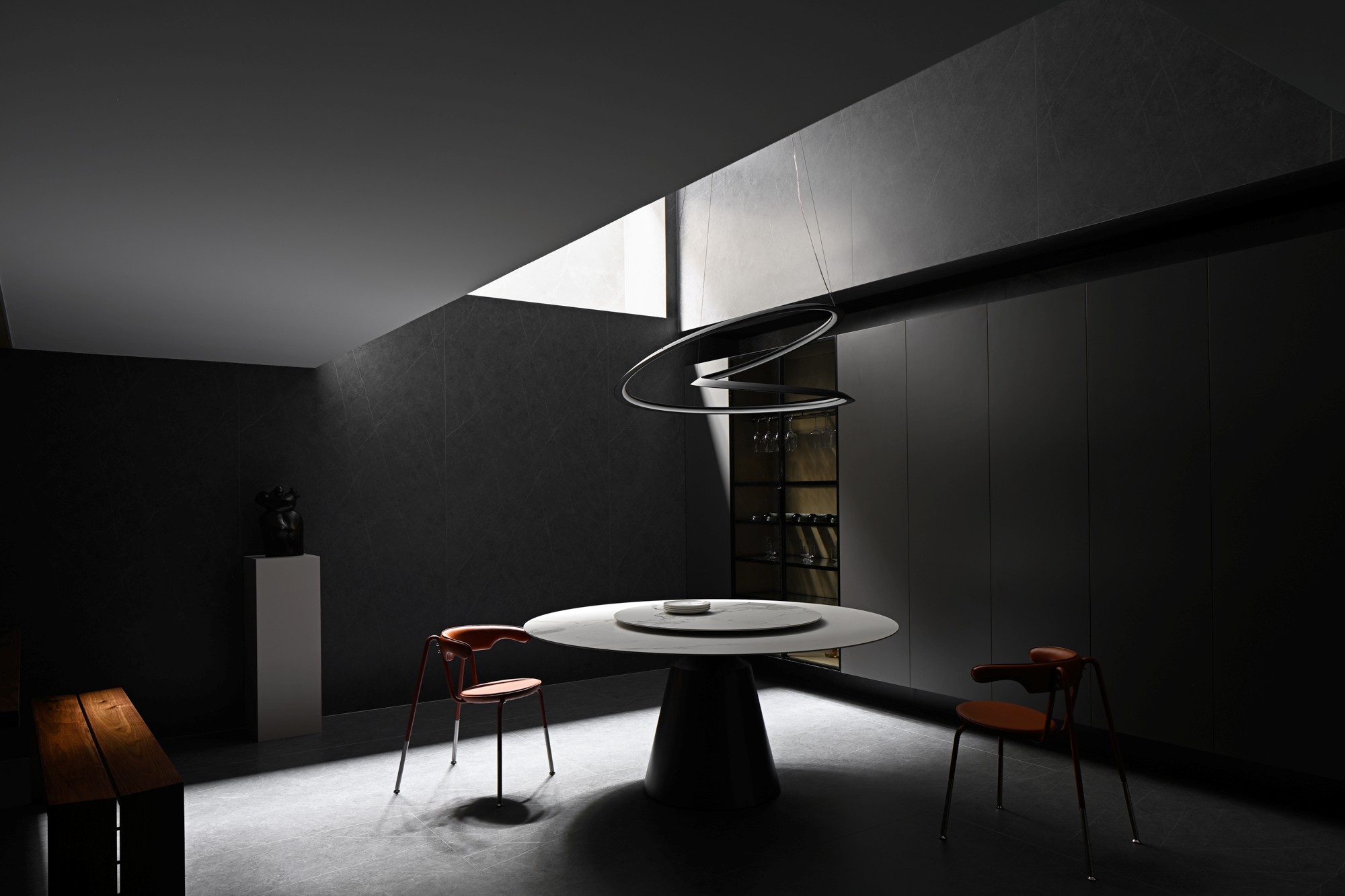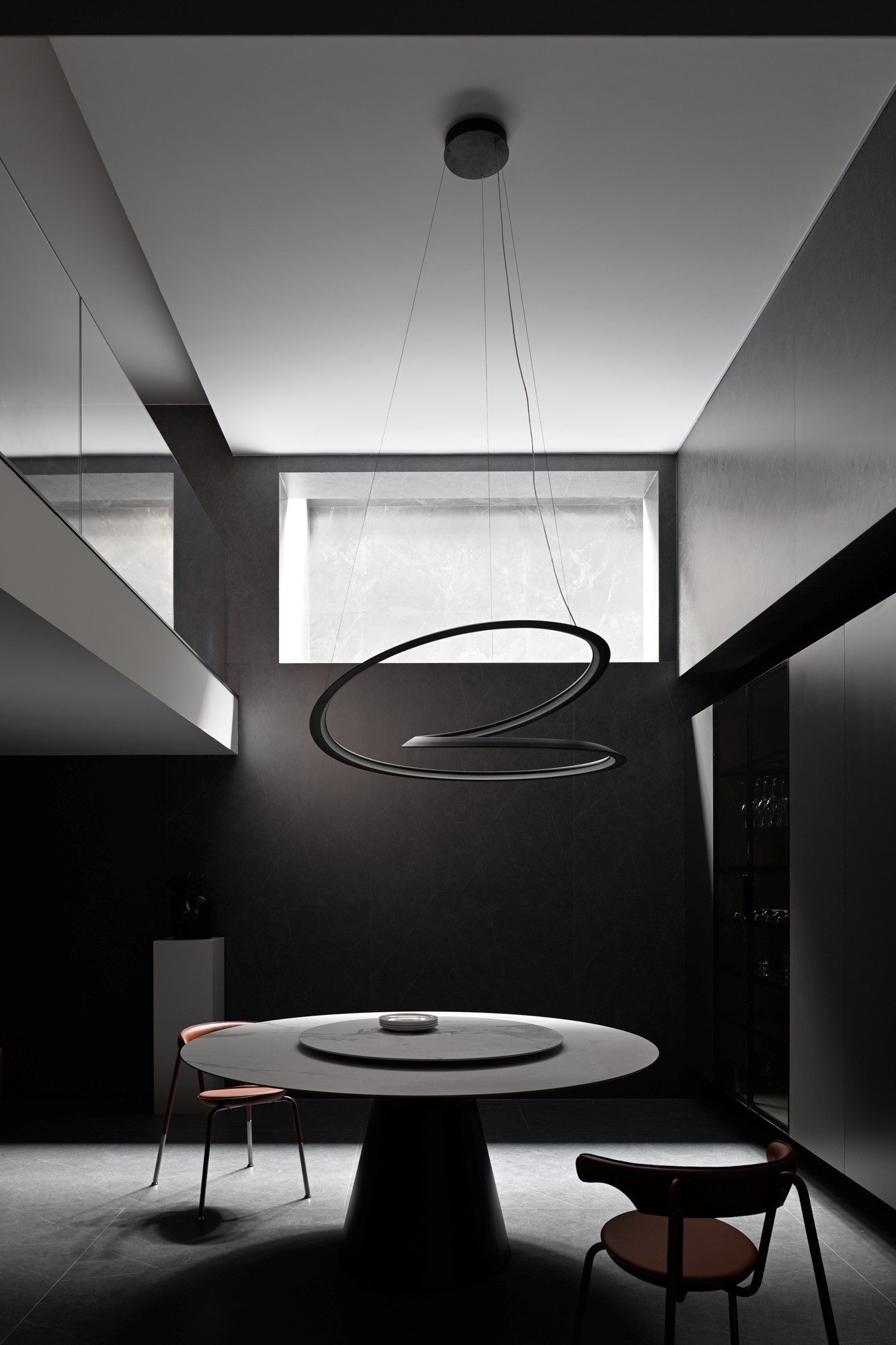 • 核心是大圆桌+悬浮式吊灯:圆桌选了“白台面+黑底座”,中和了暗调的厚重;吊灯是双环曲线造型,悬浮在空中像个艺术装置,把冷调空间衬得很灵动;