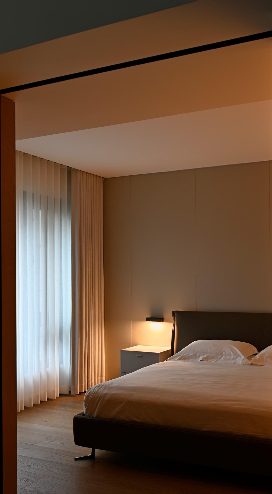 • 地面延续了客厅的浅橡木,光脚踩上去的温度,让卧室的松弛感更具体。
