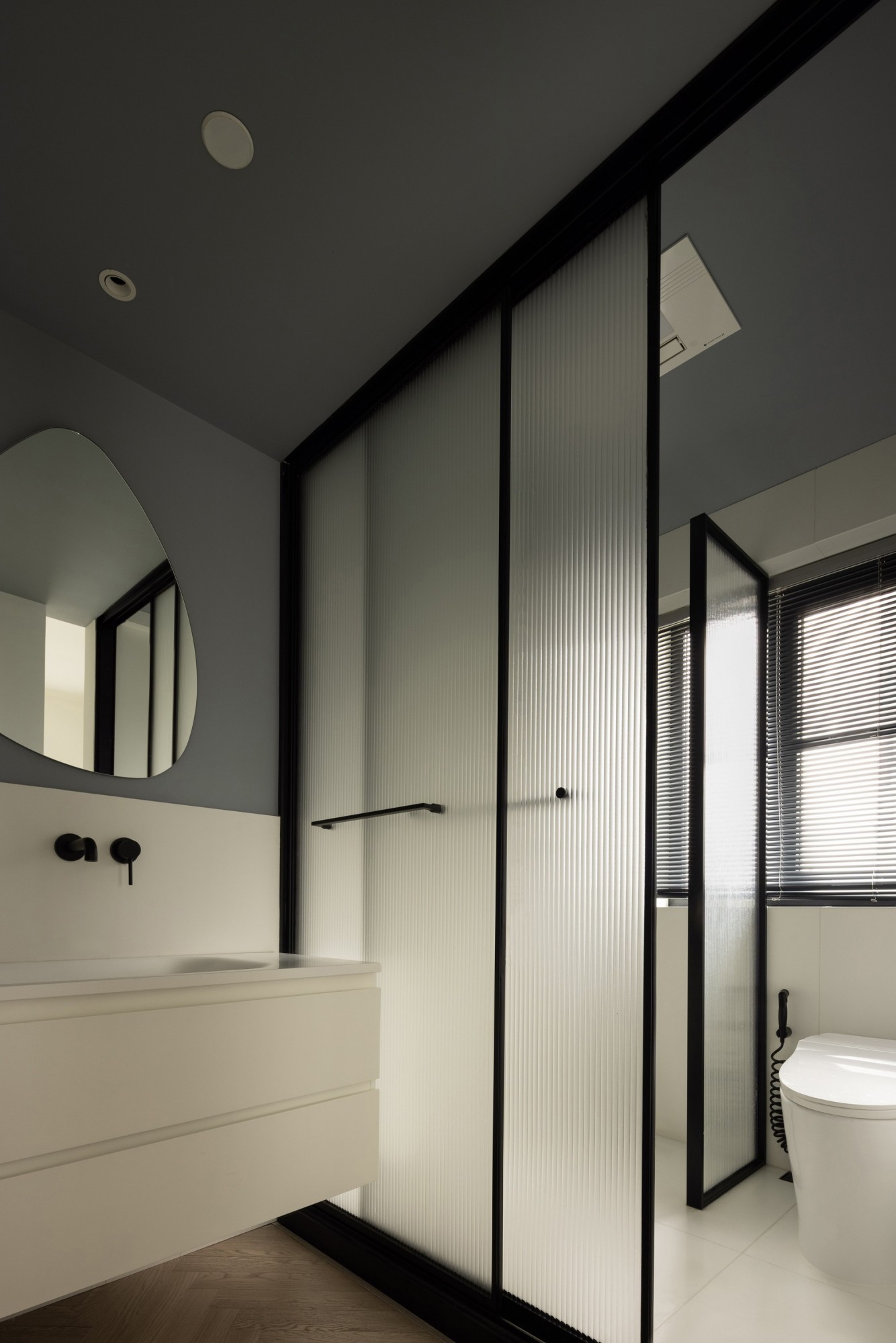 • 主调是灰墙+白柜,却靠竖纹玻璃隔断打破了冷硬:光透过玻璃变成柔雾,把浴室衬得像个安静的小角落;
