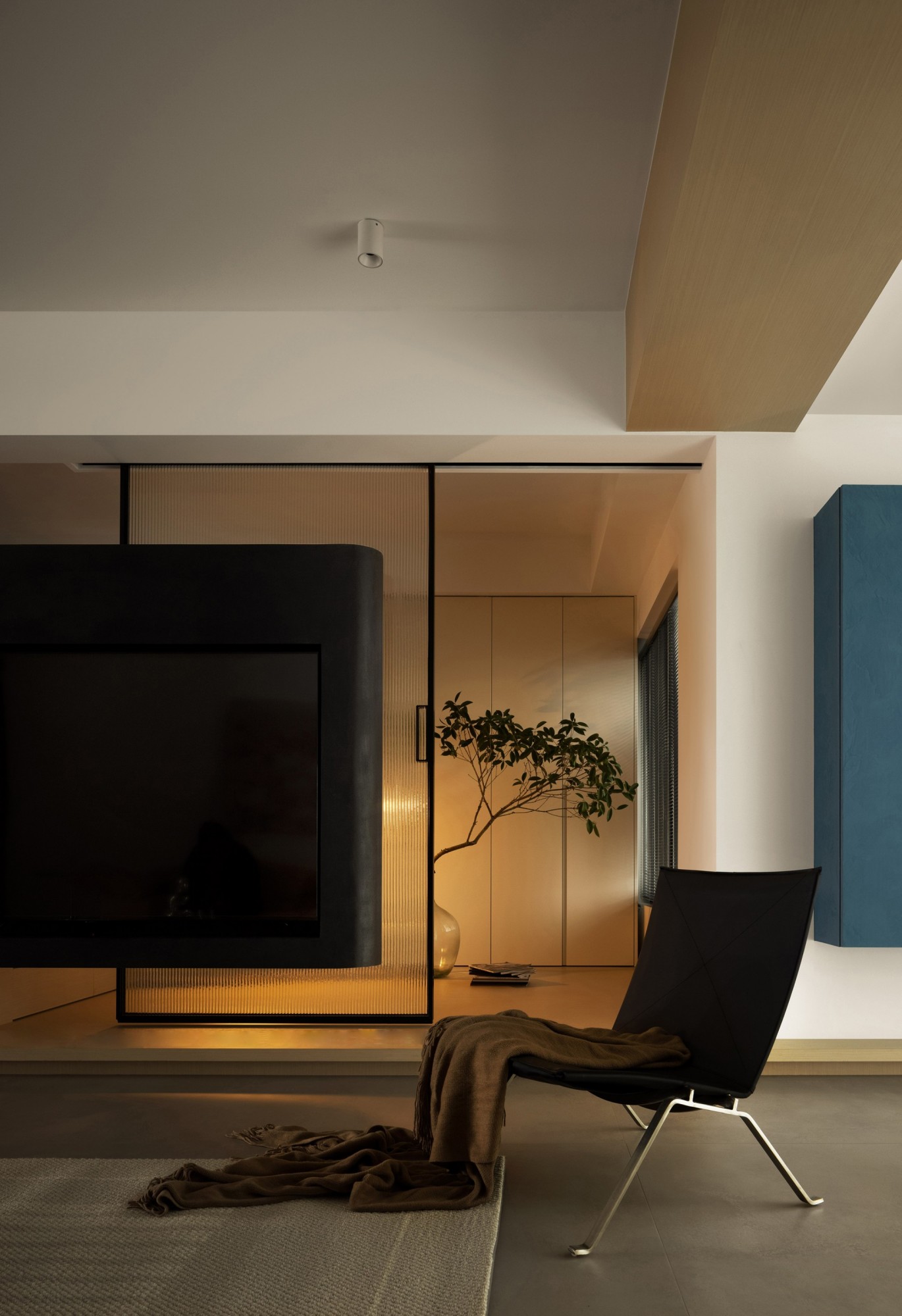 • 这是个“暗调+柔光”的包裹式空间:深色背景墙+竖百叶窗,把外界的纷扰都挡在外面;