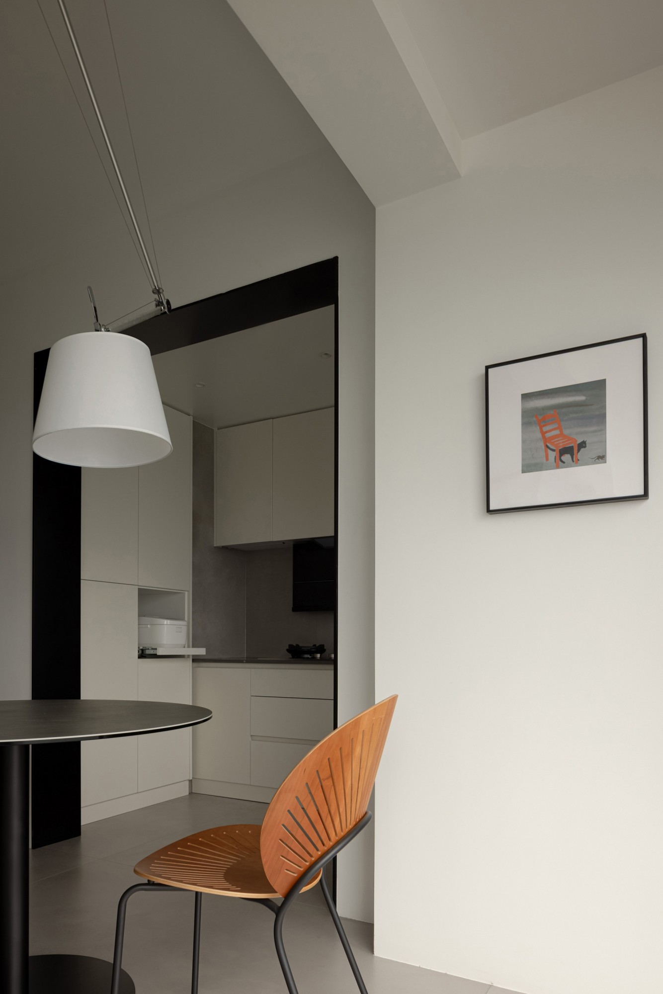 • 空间是“白墙+黑柜”的干净框架,却靠木色餐椅添了温柔;