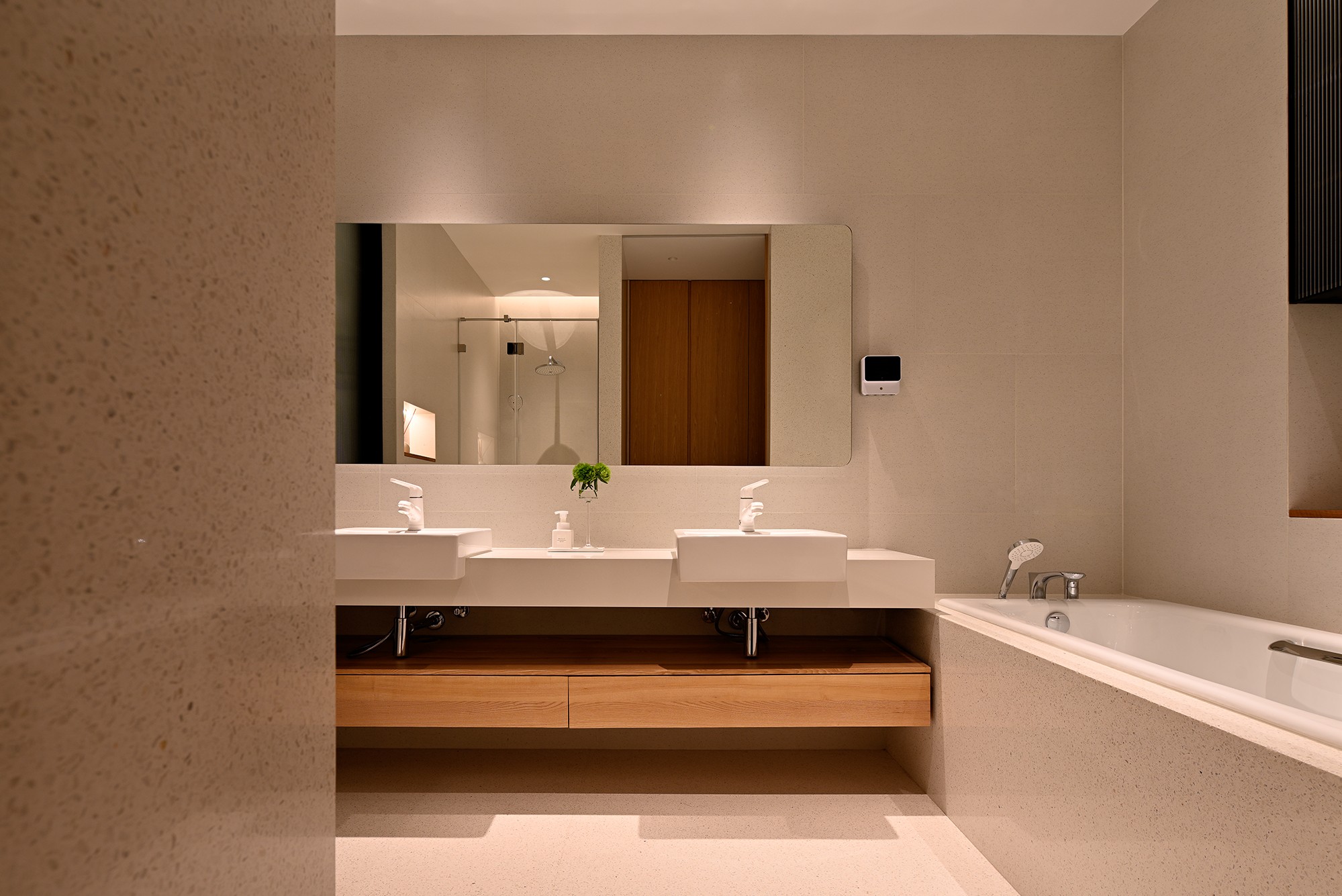• 实用又高级:双台盆设计(早上不用抢洗手池)、悬浮原木柜(藏起杂物还显轻盈),浴缸边的墙面延续了水磨石质感,泡澡时像泡在“自然里”;