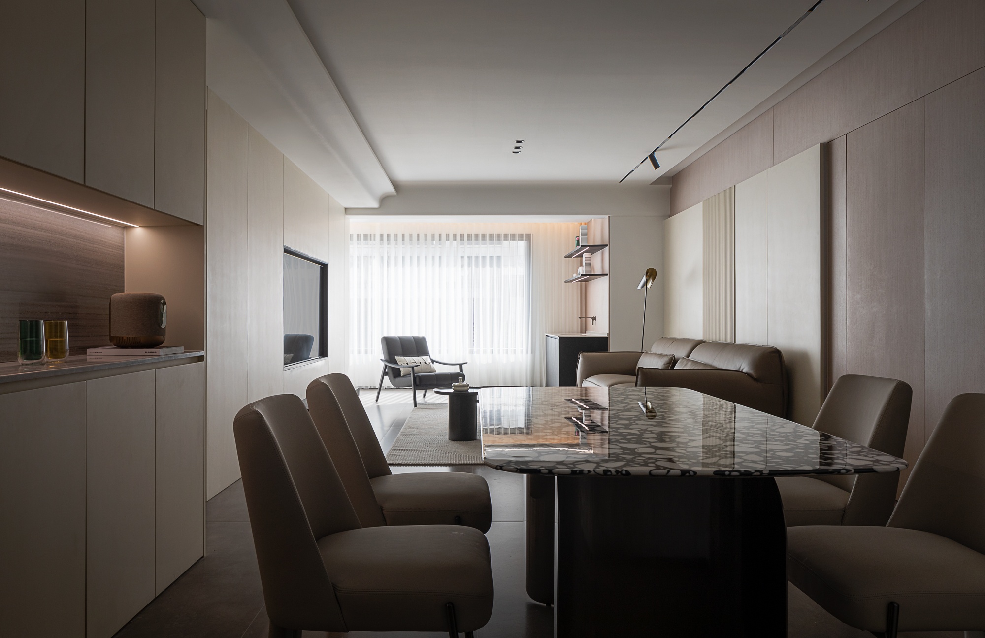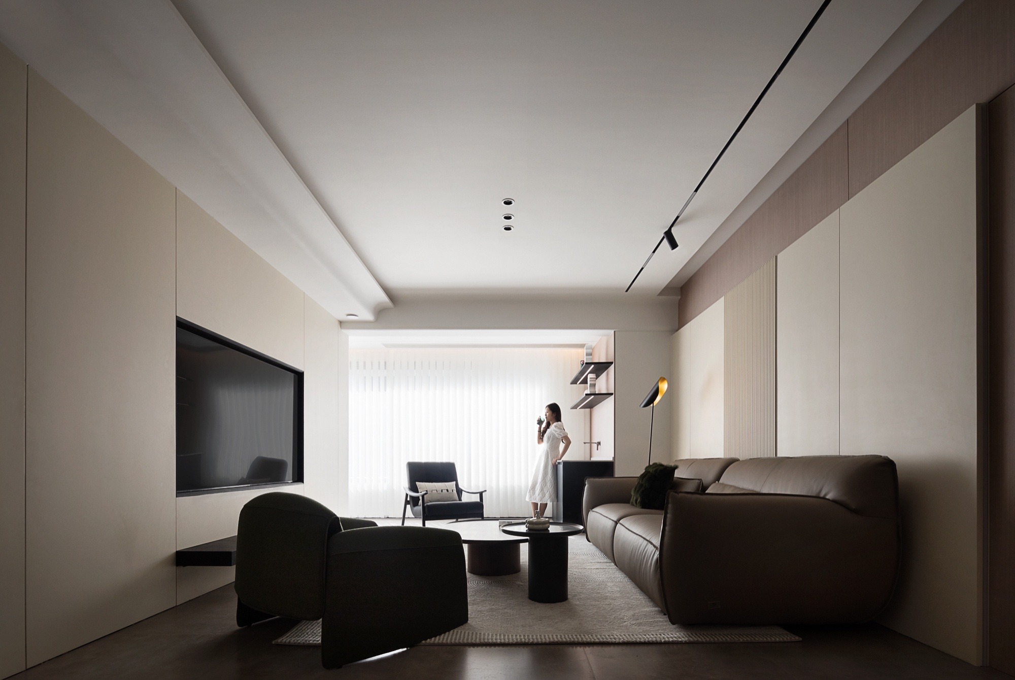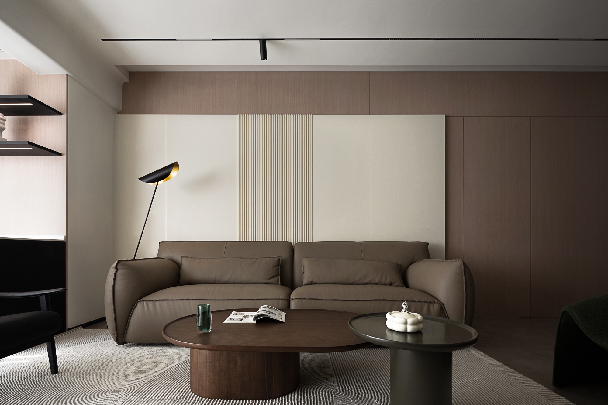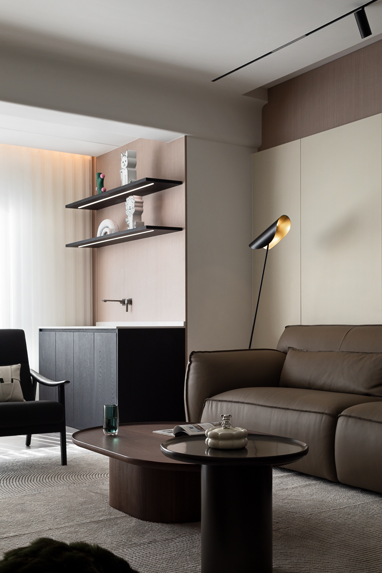 • 客厅:浅米色护墙+木质纹理拼接,搭配皮质沙发与弧形单椅,轨道灯与隐藏式光源让空间明暗层次柔和,大窗的柔纱帘滤进自然光线,整体松弛又有格调。