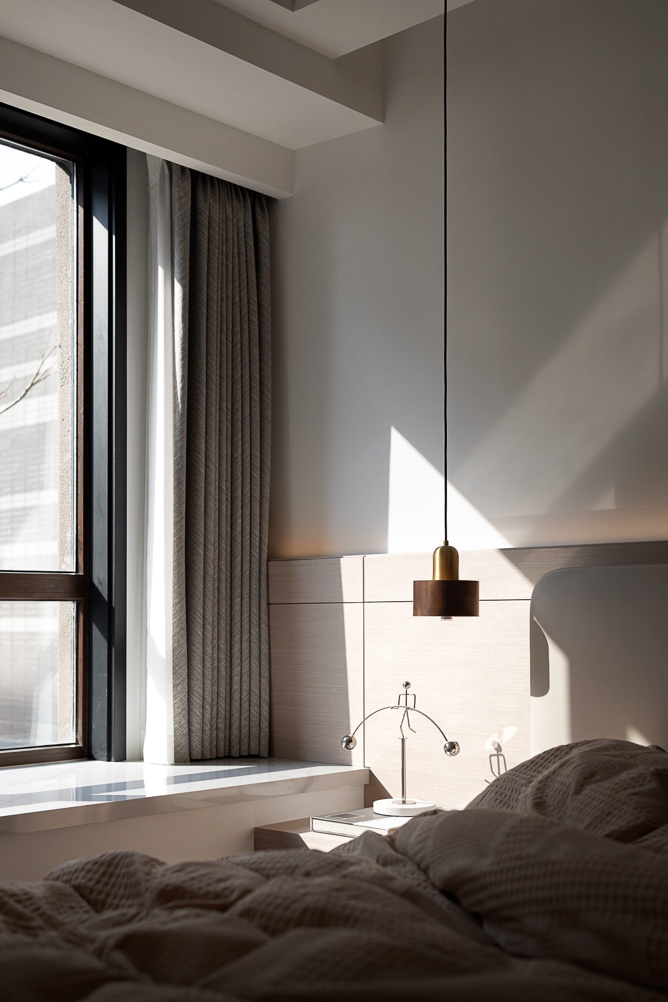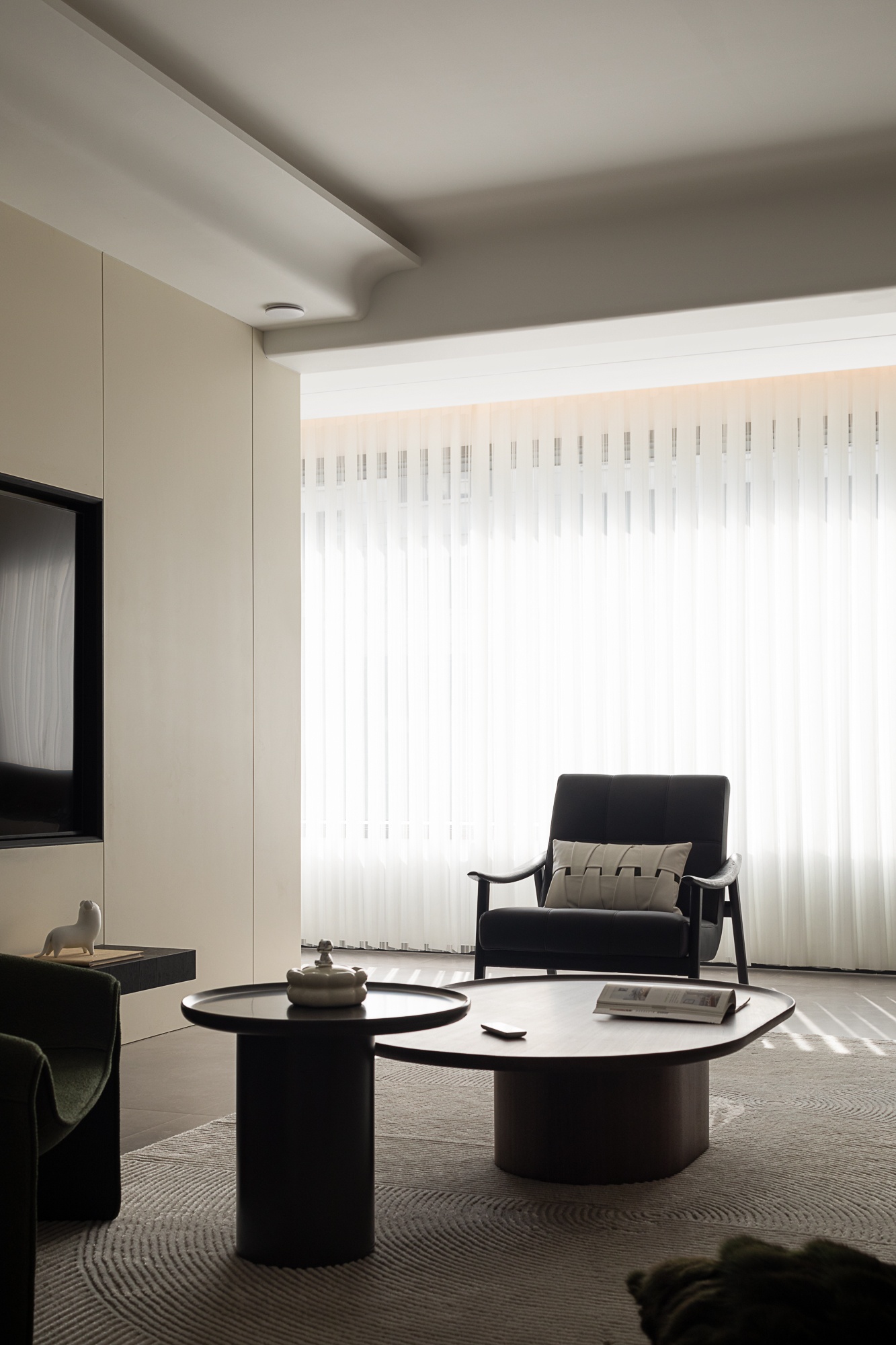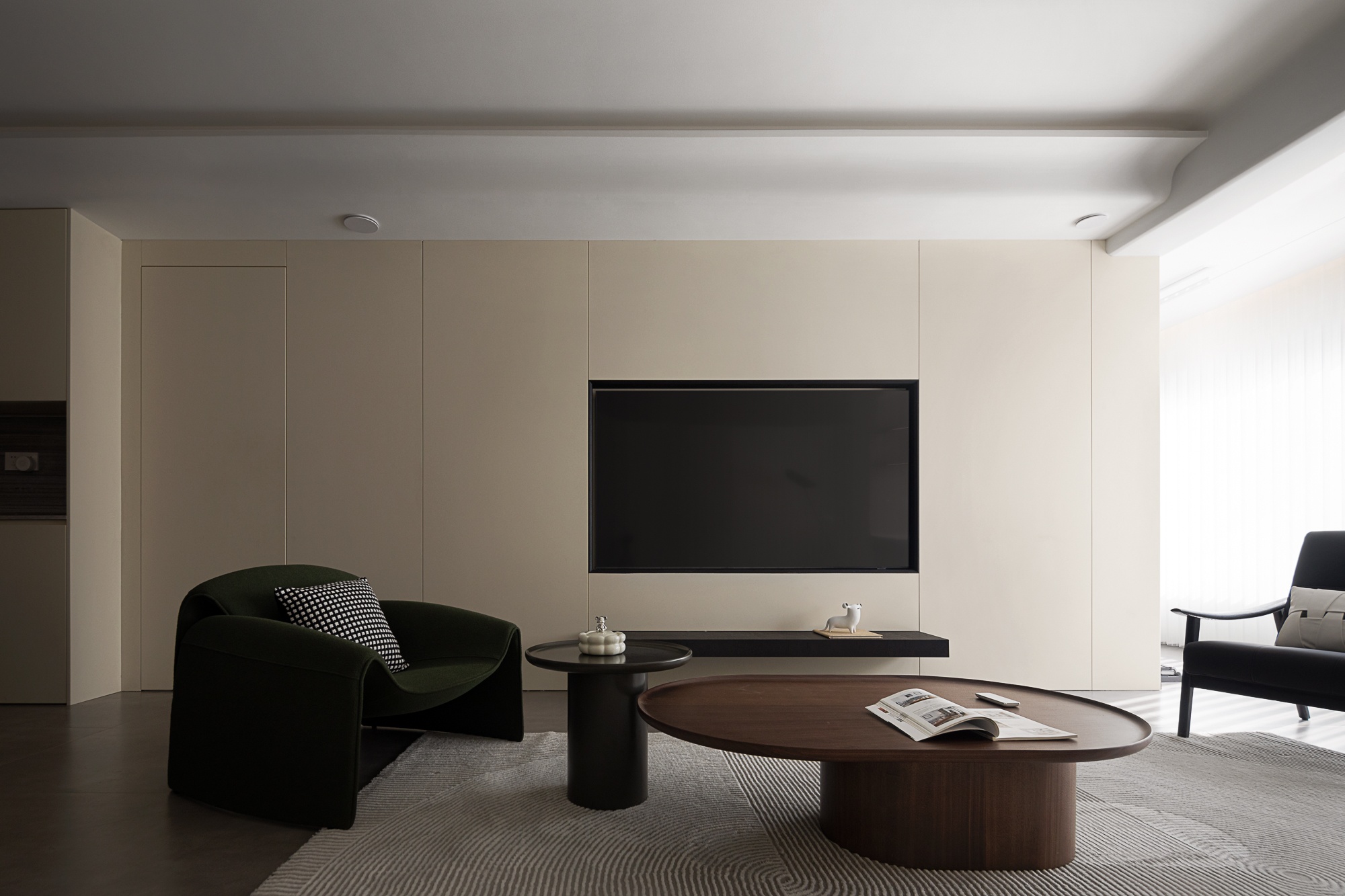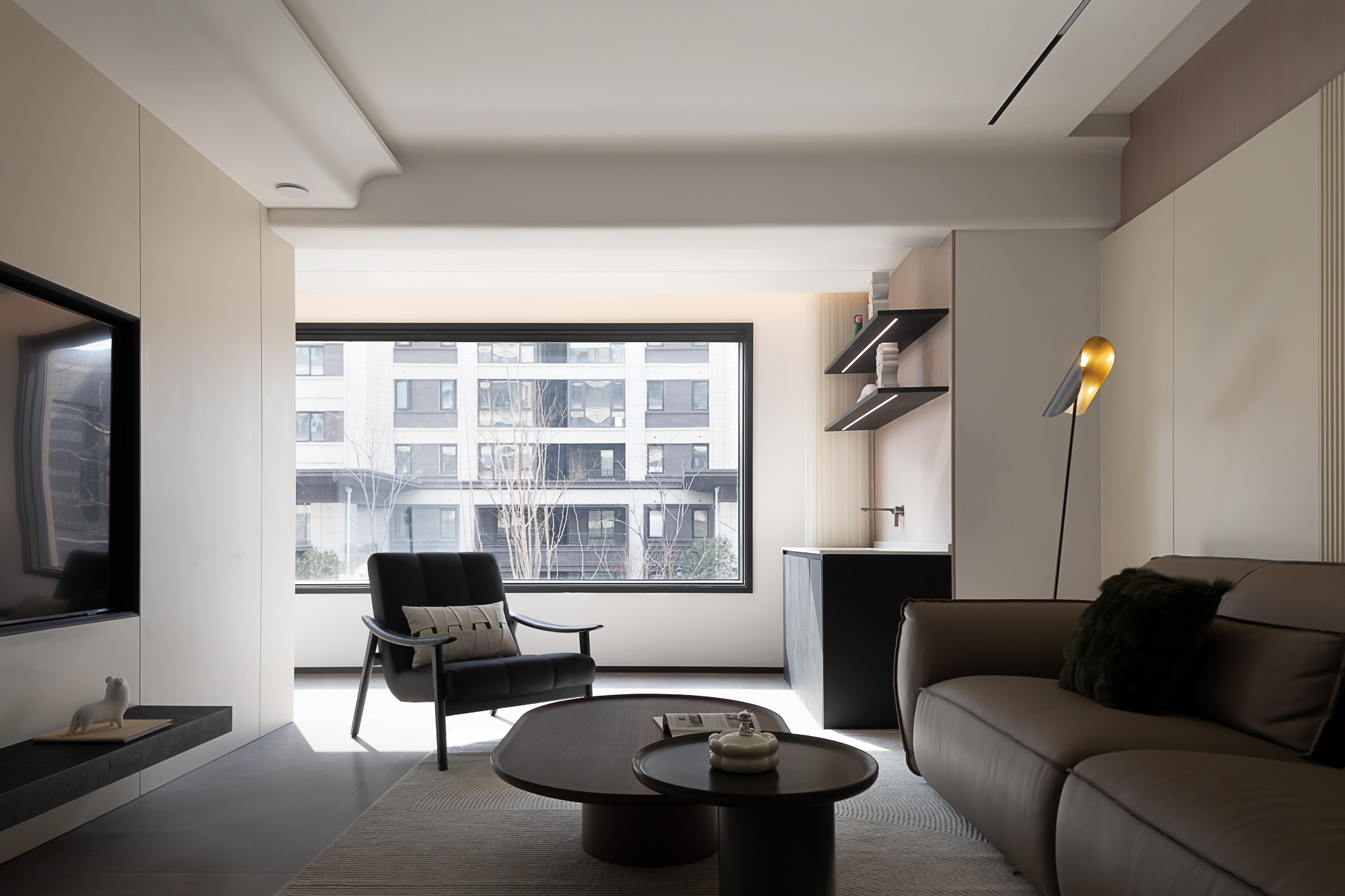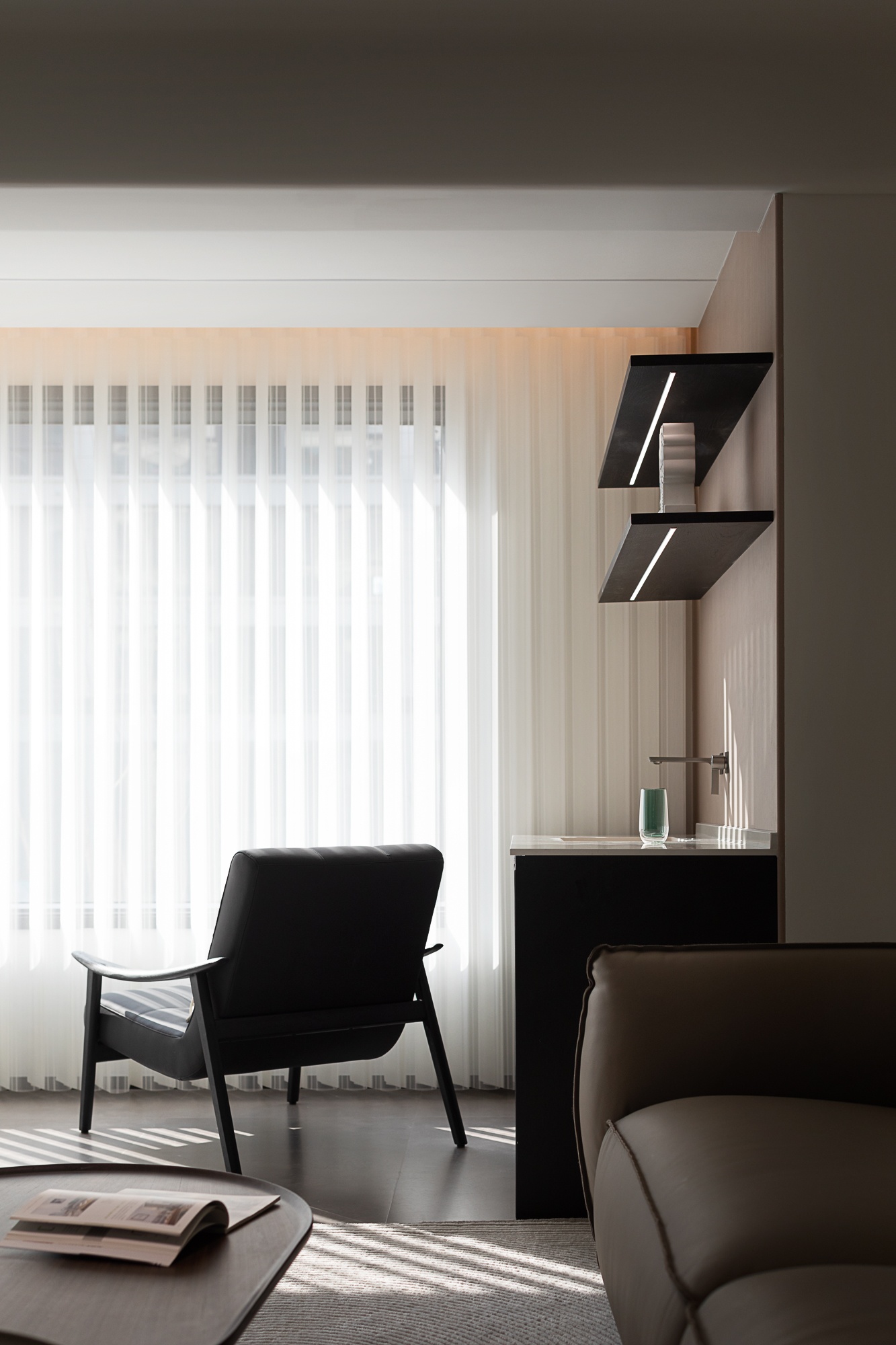 • 客厅:浅米色护墙+木质纹理拼接,搭配皮质沙发与弧形单椅,轨道灯与隐藏式光源让空间明暗层次柔和,大窗的柔纱帘滤进自然光线,整体松弛又有格调。