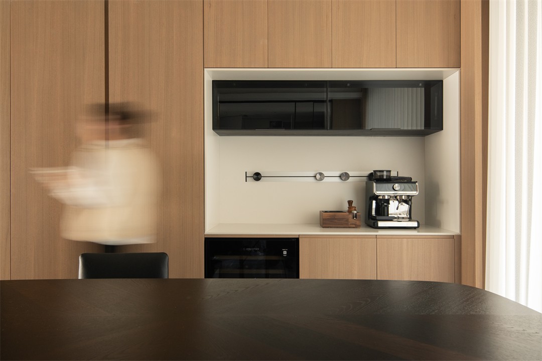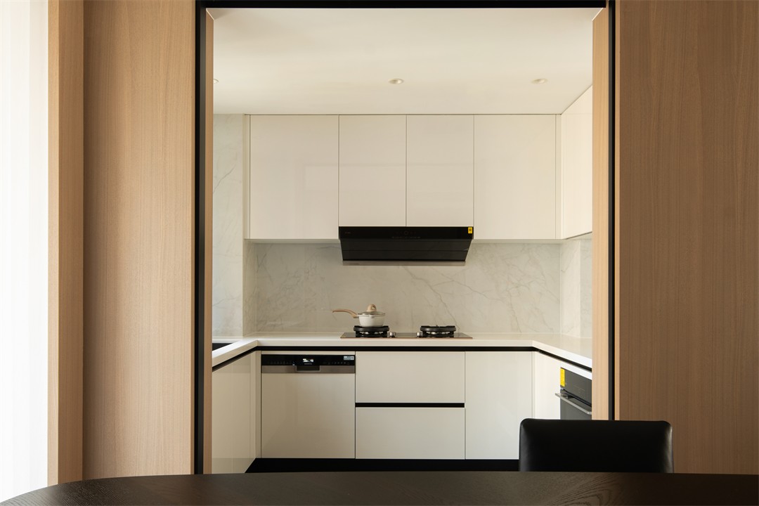 餐厅的黑桌与木色柜体形成冷暖对冲,嵌入式咖啡区把“烟火气”藏进极简界面;厨房以白柜+大理石纹墙打造干净基底,黑色家电线条是低调的质感点缀,开合之间,烹饪的实用与空间的整洁无缝衔接。