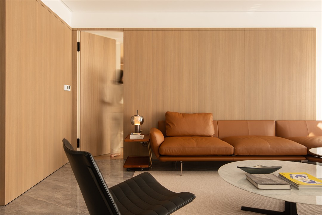 浅木纹理包裹墙面,消解了空间的冷硬;焦糖棕皮质沙发带着慵懒的松弛感,却以利落的线条守住极简调性;黑色单椅的几何骨架、玻璃圆桌的轻盈,让柔和里多了几分“刚”的精致。百叶帘滤过的光线铺在地面,连阴影都成了温柔的装饰。
