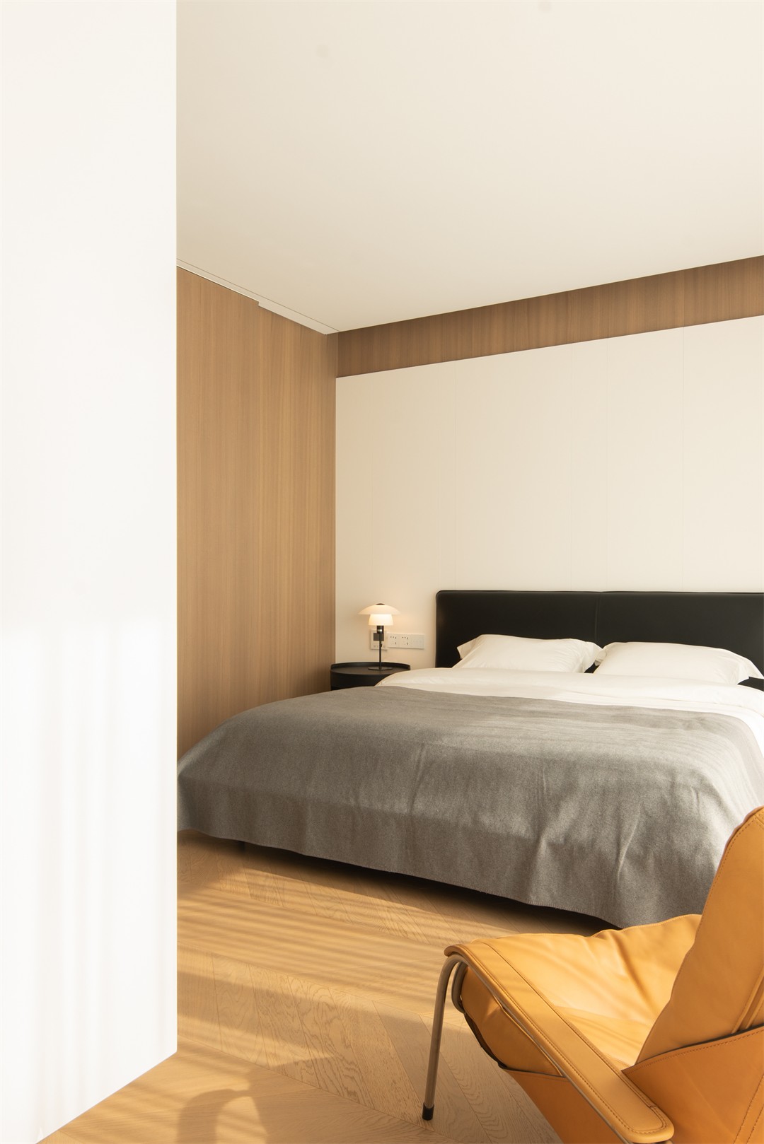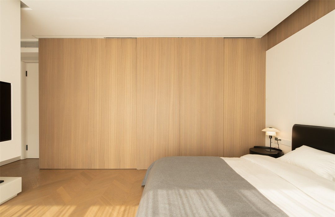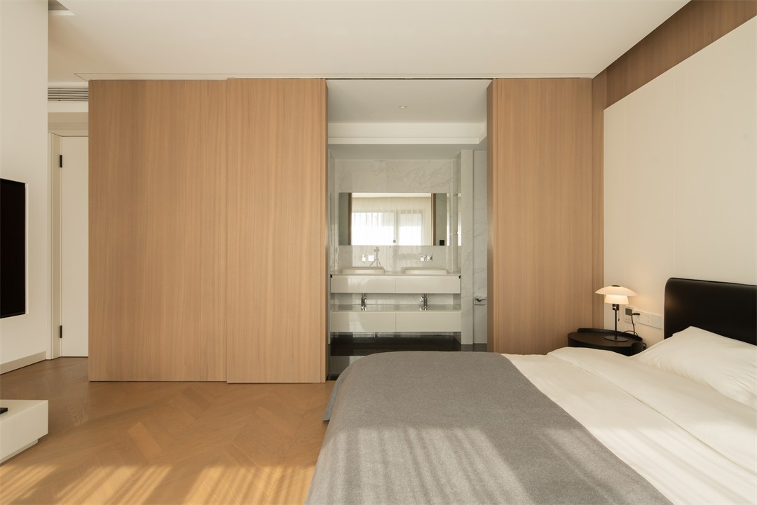 人字拼木地板暖了脚感,木色移门轻推便衔接卫浴,把“通透感”拉满;床品的灰与白是安静的底色,阳光斜切在床沿,连时间都慢了下来——松弛,是这里最直观的体感。