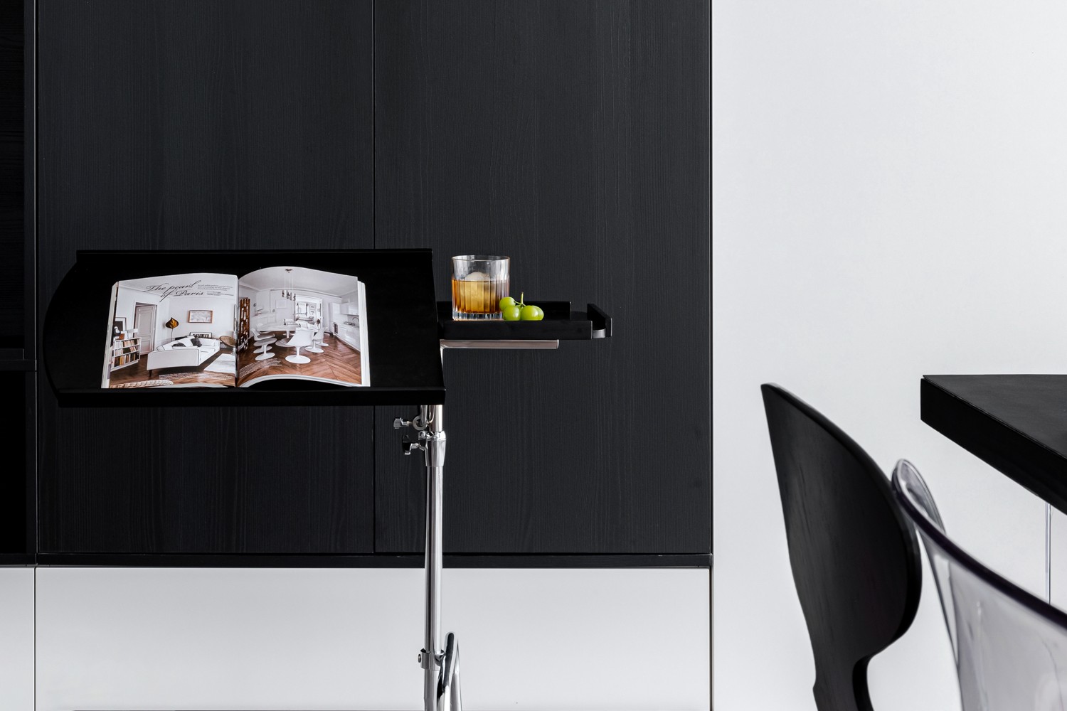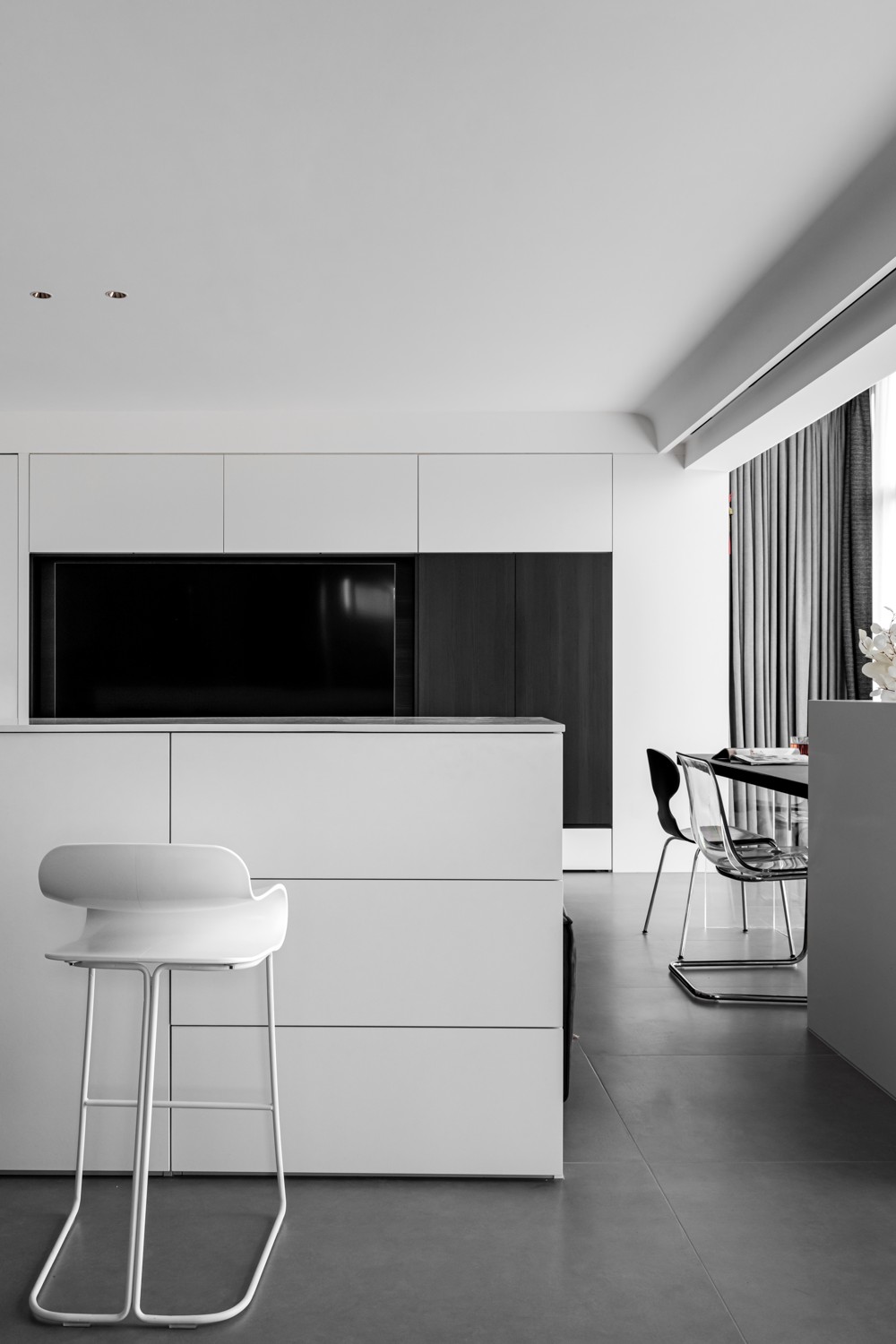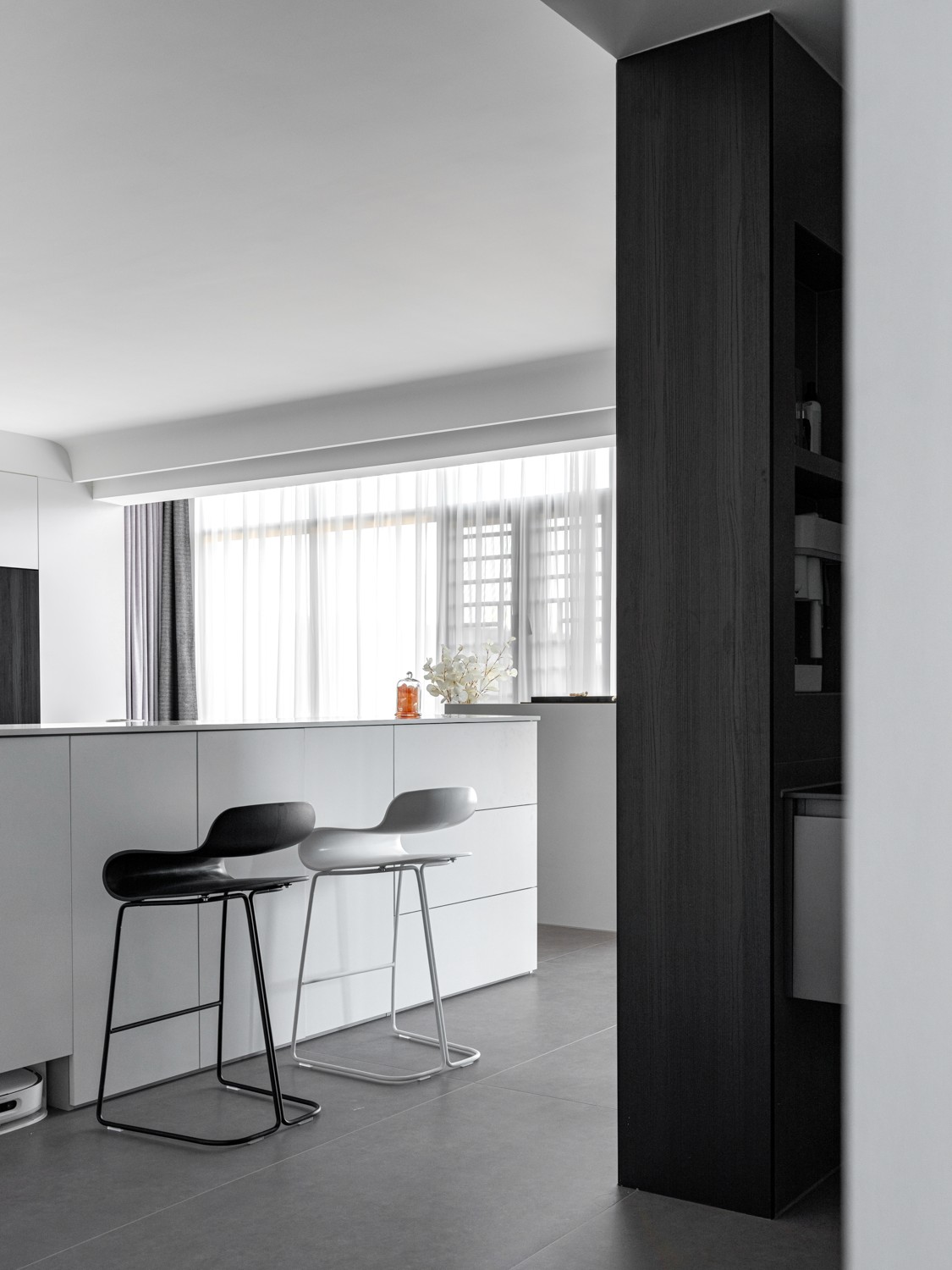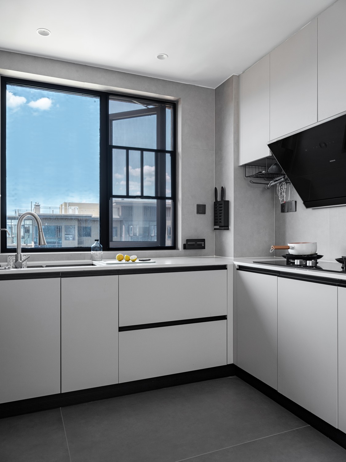 纯白柜体与深灰台面撞出“冷静的烟火气”,嵌入式厨电把琐碎藏进墙里,U型台面让备菜、烹饪、盛盘动线像“自动巡航”。黑框窄窗把窗外的光裁成条,落在干净的台面上,连锅铲碰撞声都变得轻快。
