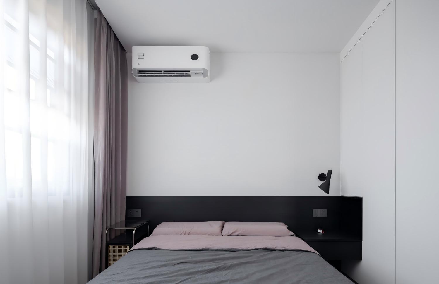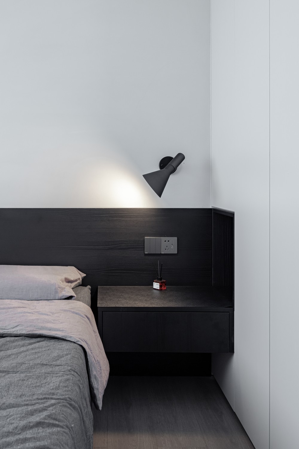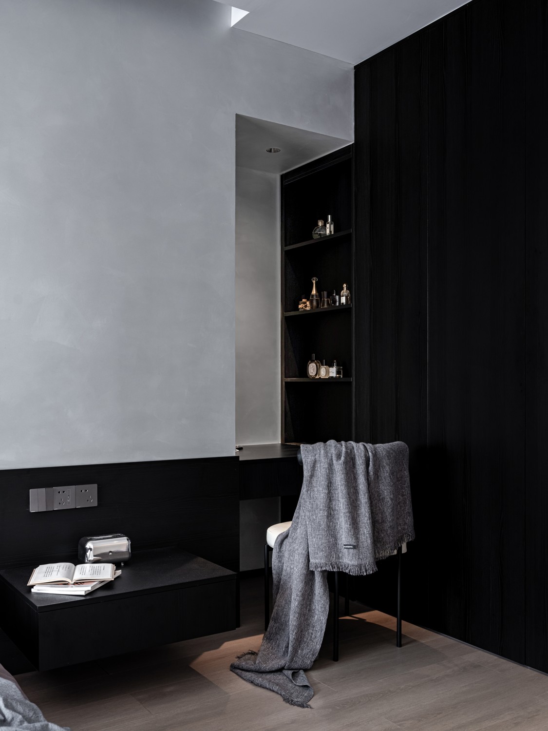 浅灰艺术漆墙面像“被揉过的云”,悬浮式黑床头板是视觉锚点,床品选了同色系的软糯面料——连毛孩子都爱蜷在上面打盹。隐形门后藏着开放式置物架,深夜小酌的酒杯、香薰,都有了妥帖的归处。