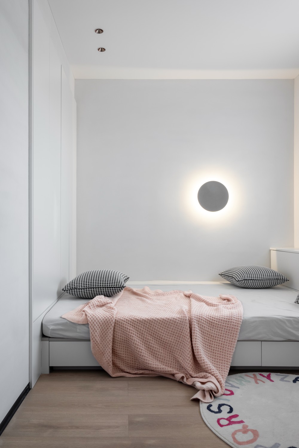 榻榻米+书桌的一体化设计,是“次卧/书房/毛孩子乐园”的三重奏:白天是办公区,铺开电脑就能敲字;晚上铺上粉毯,秒变客卧;连角落的字母地毯,都是宠物的专属“撒欢地”。圆镜壁灯暖光一落,小空间也裹着温柔。