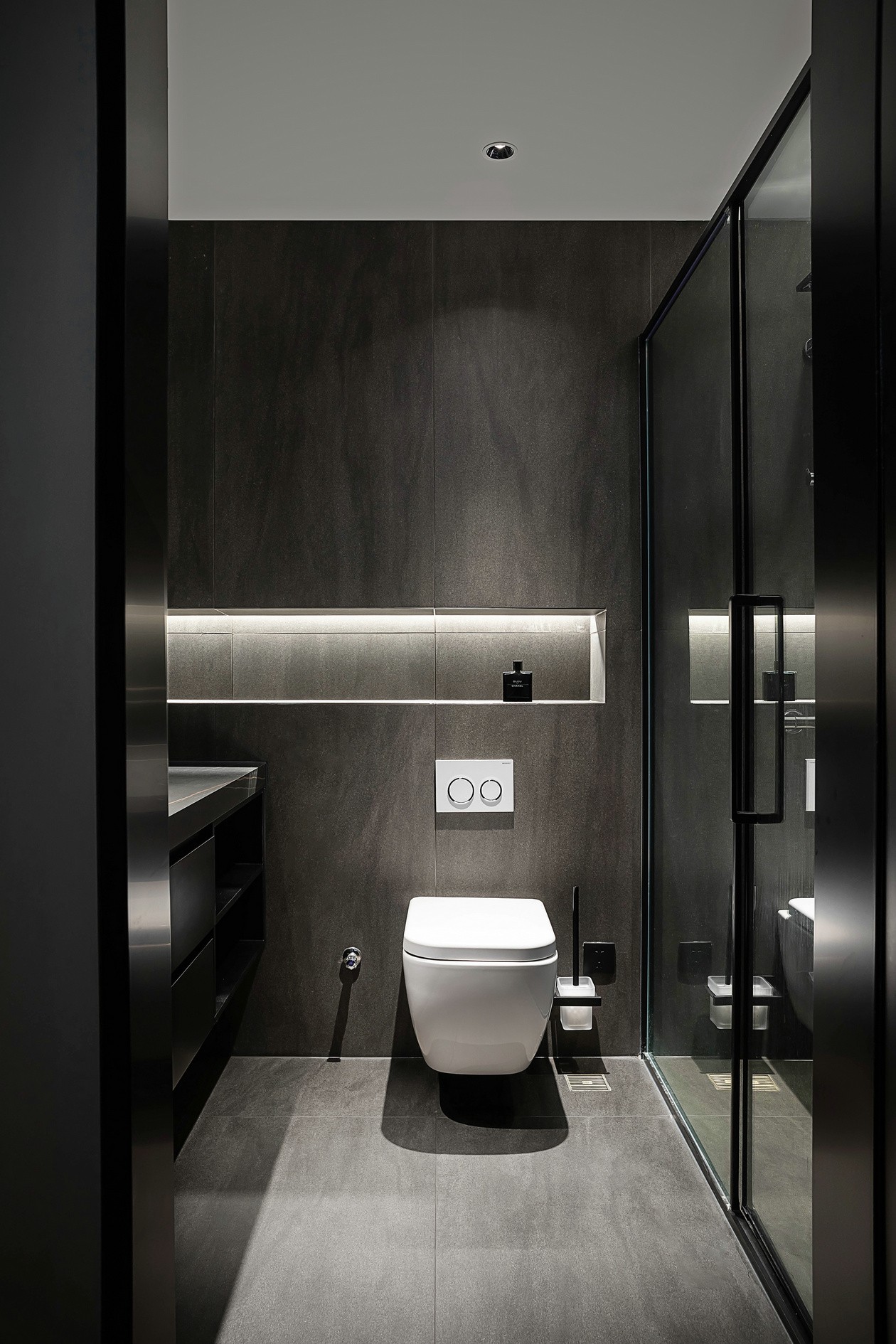 深灰石纹墙是“低调的背景板”,壁龛里的香薰是暗调里的精致,悬浮马桶扫光卫生死角,玻璃淋浴间把水汽锁在里面——连洗漱都成了“不慌不忙的仪式感”。